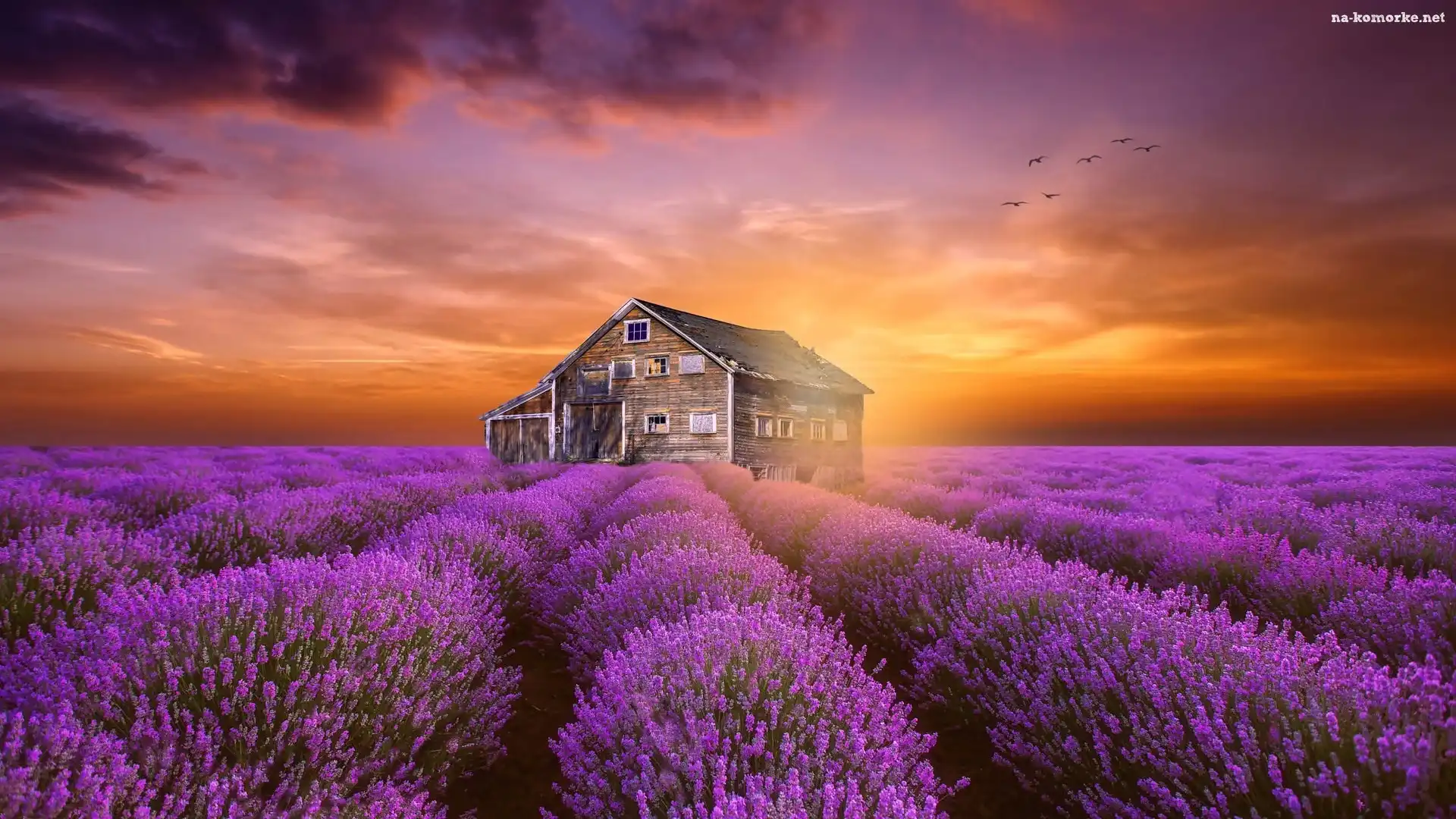 Zachód słońca, Dom, Pole, Lawenda na Komórkę