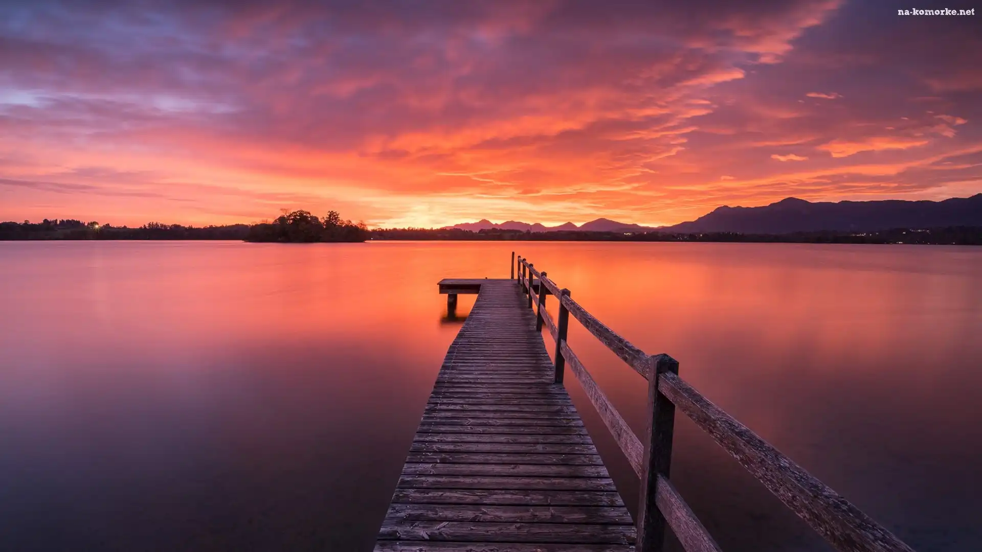 Zachód słońca, Góry, Jezioro, Pomost, Drzewa na Komórkę