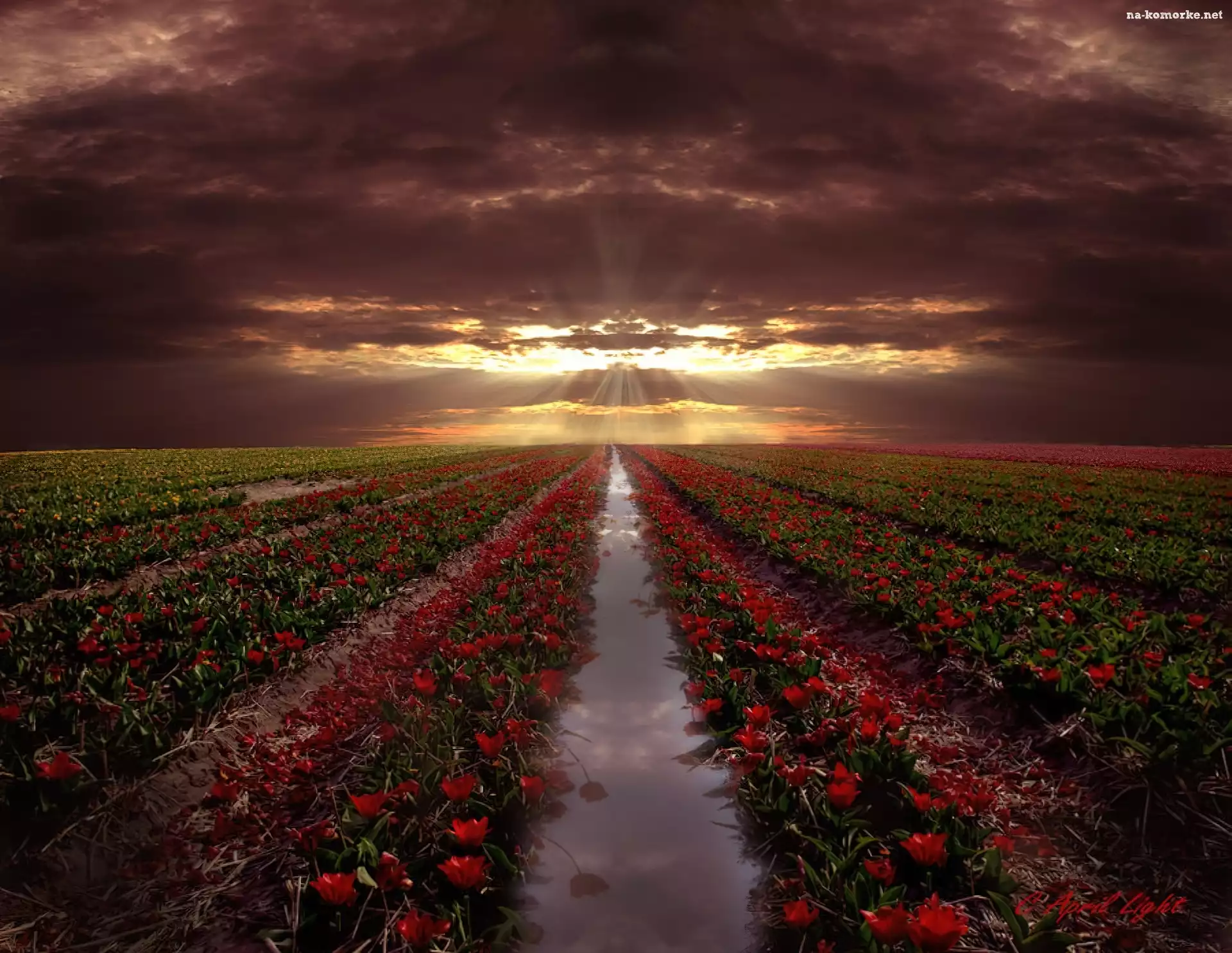 Zachód Słońca, Tulipany, Promienie, Pole na Komórkę