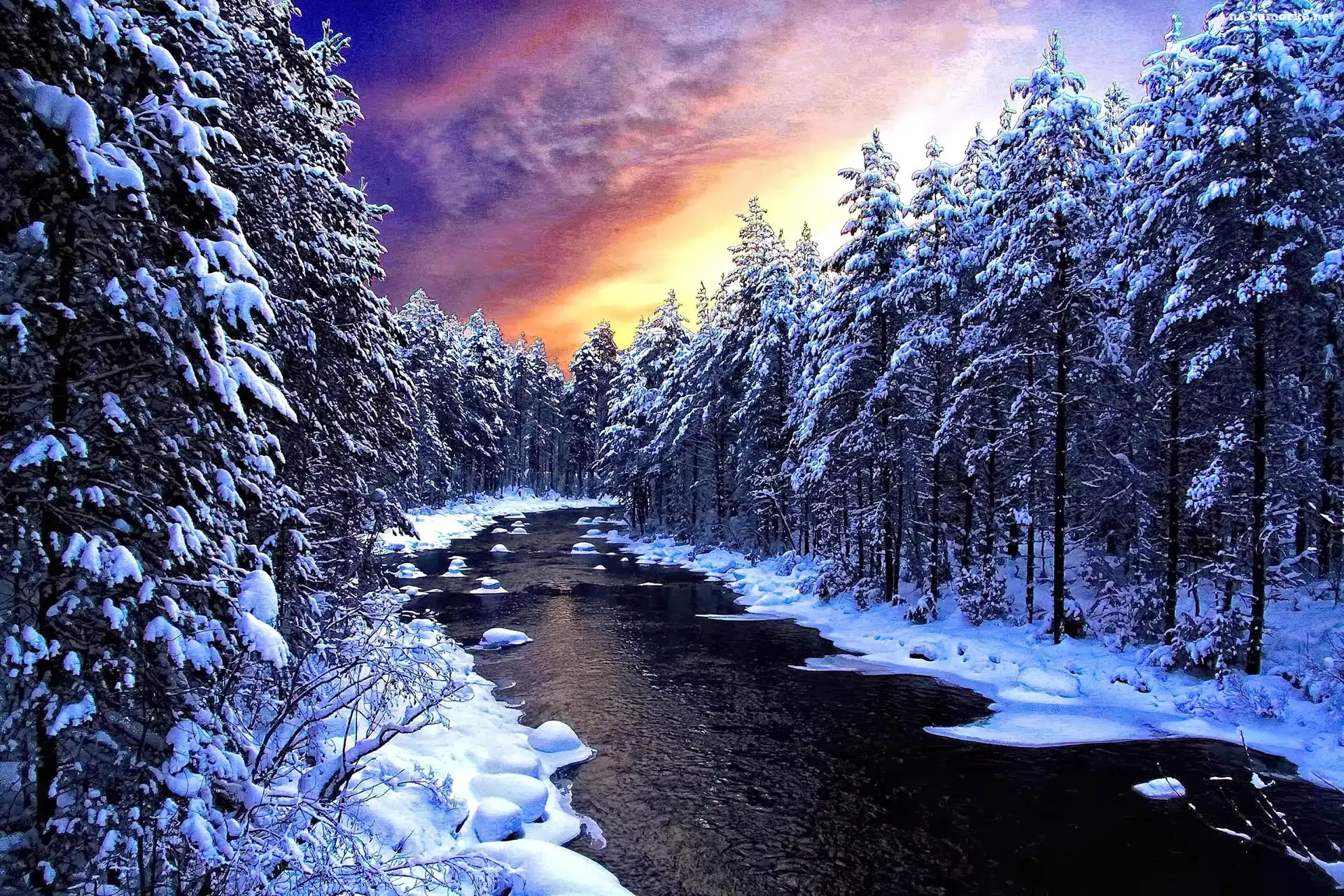 Zachód Słońca, Zima, Rzeka, Las na Komórkę