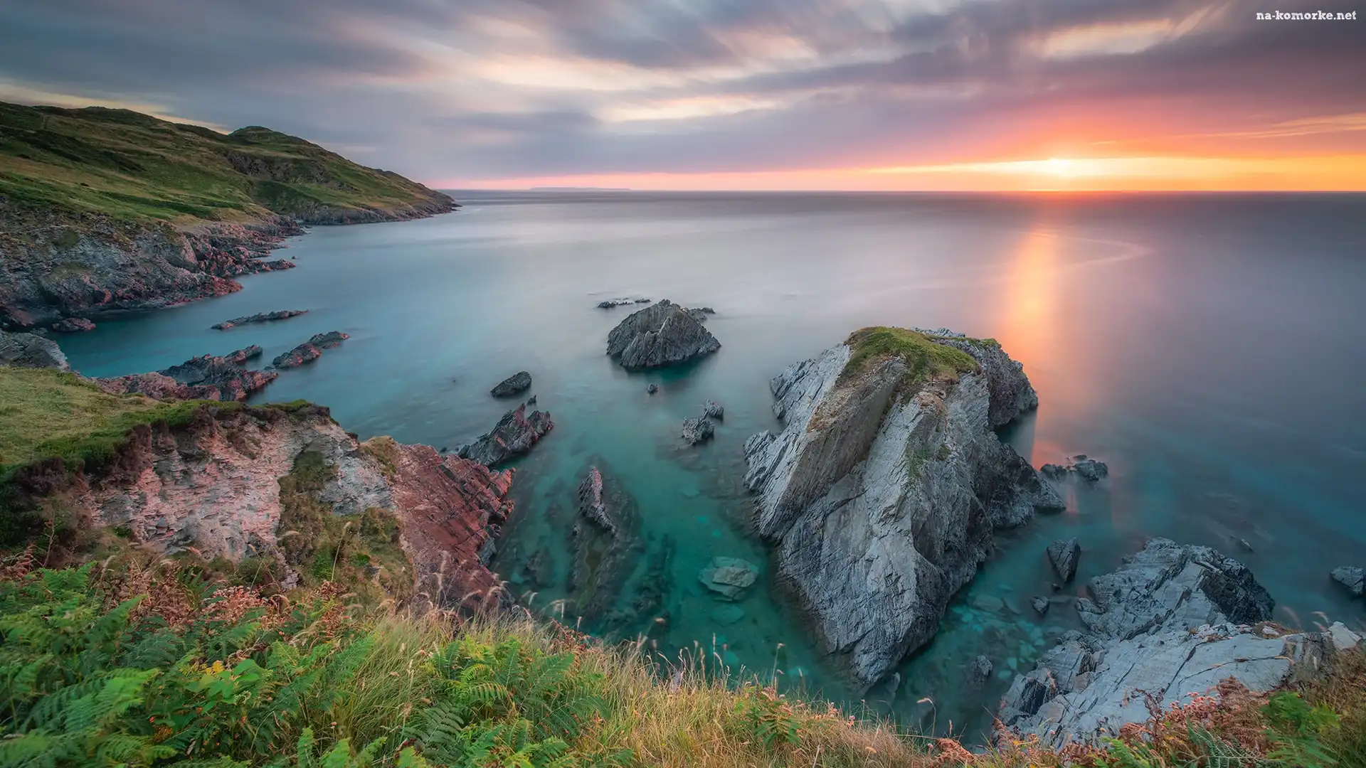 Zachód słońca, Morze, Wybrzeże, Skały, Chmury na Komórkę