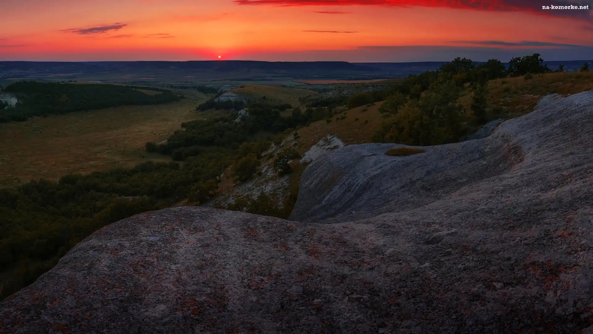 Zachód słońca, Wyżyny, Skały, Drzewa na Komórkę