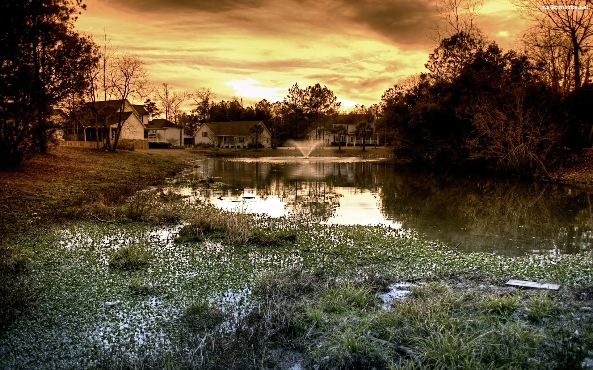 Zachód, Budynki, Słońca, Staw na Komórkę