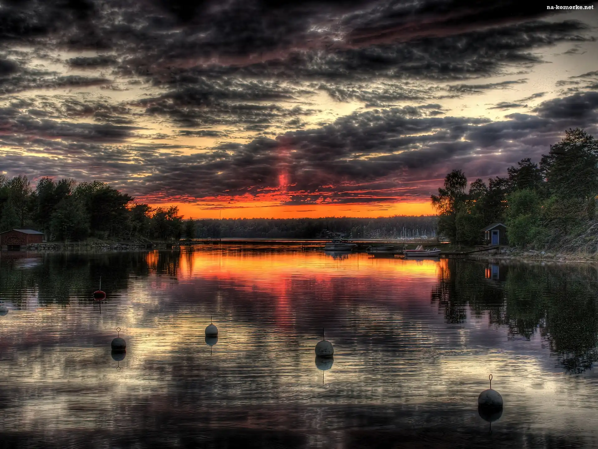 Zachód, Chmury, Słońca, Jezioro na Komórkę