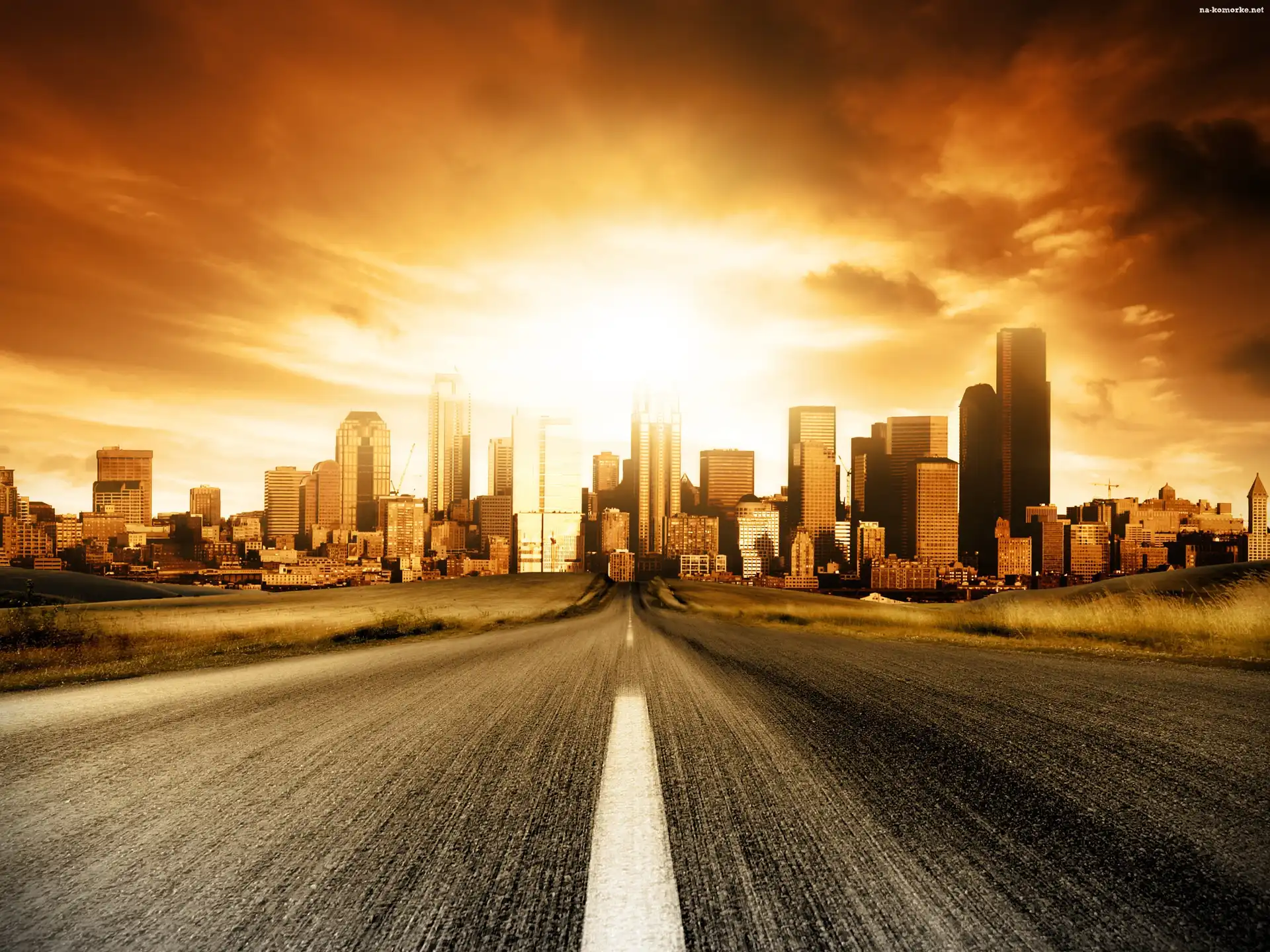 Zachód, Droga, Słońca, Wieżowce na Komórkę