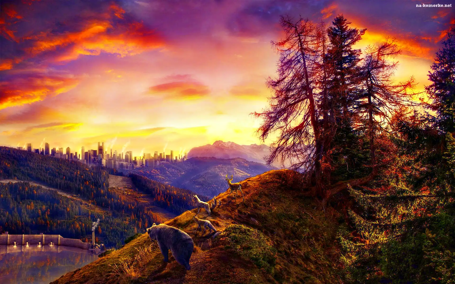 Zachód, Drzewa, Słońca, Góry na Komórkę