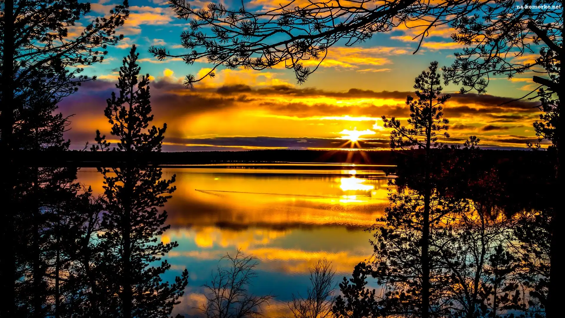Zachód, Drzewa, Słońca, Jezioro na Komórkę