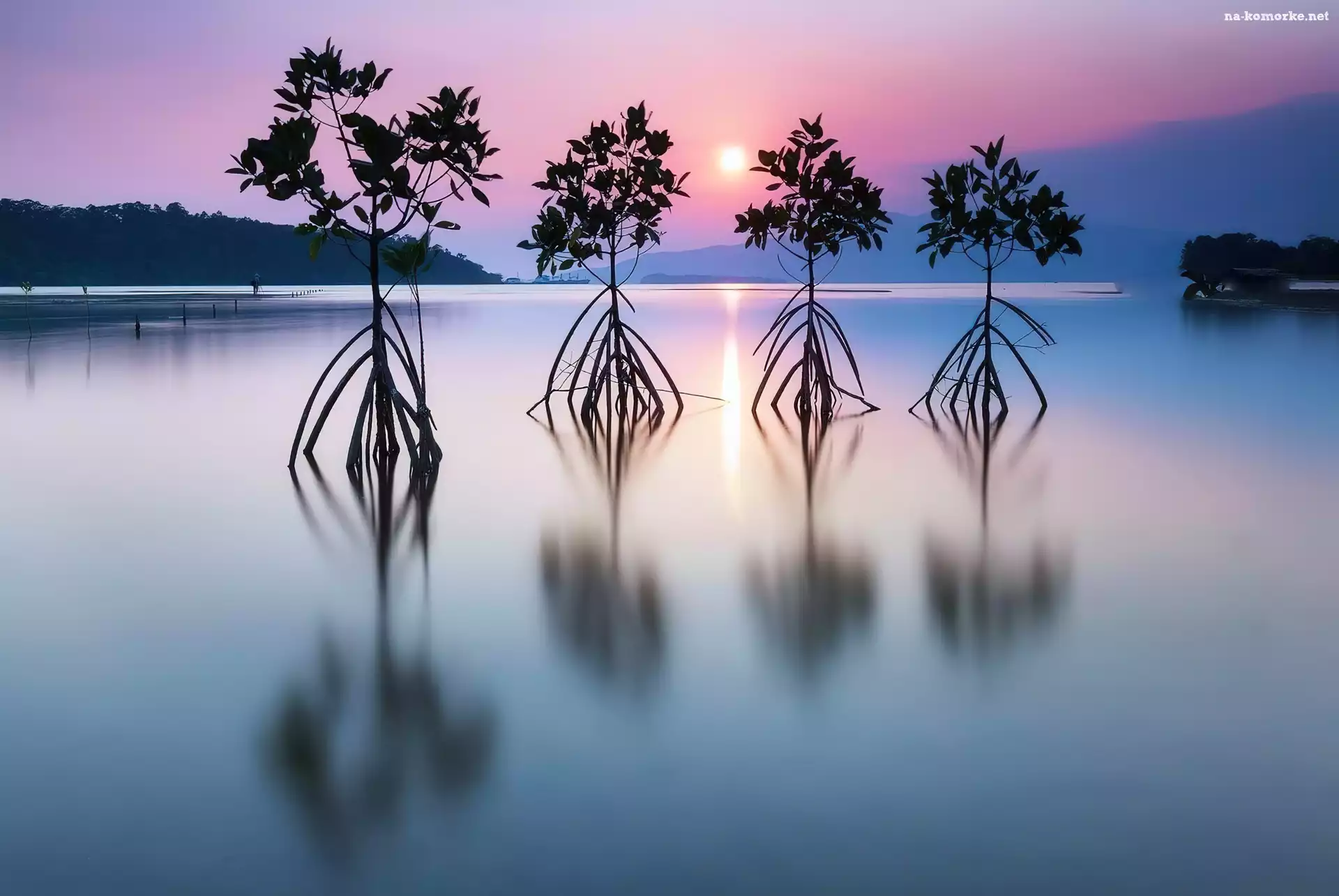 Zachód, Drzewa, Słońca, Jezioro na Komórkę