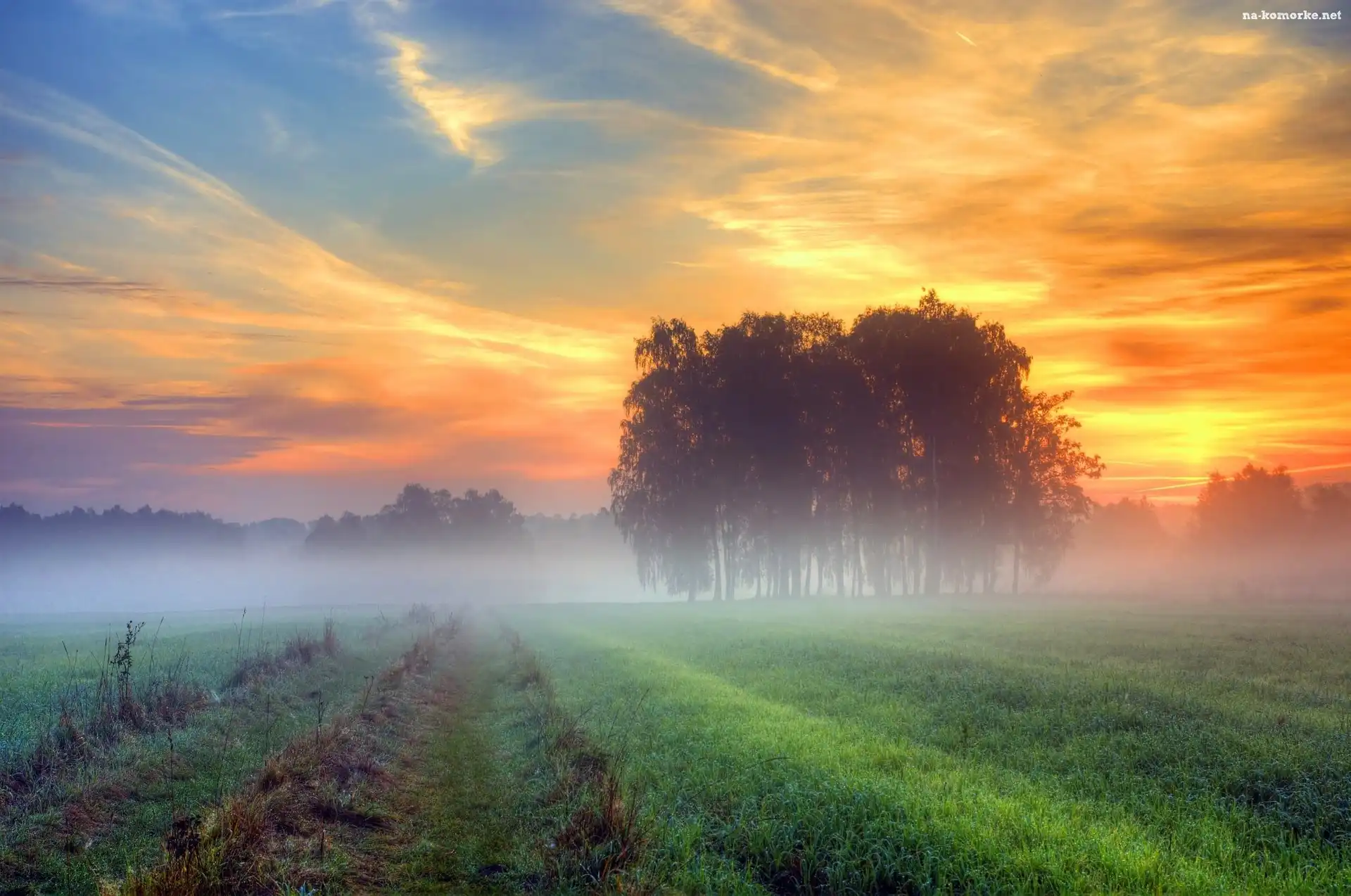 Zachód, Drzewa, Słońca, Mgła na Komórkę