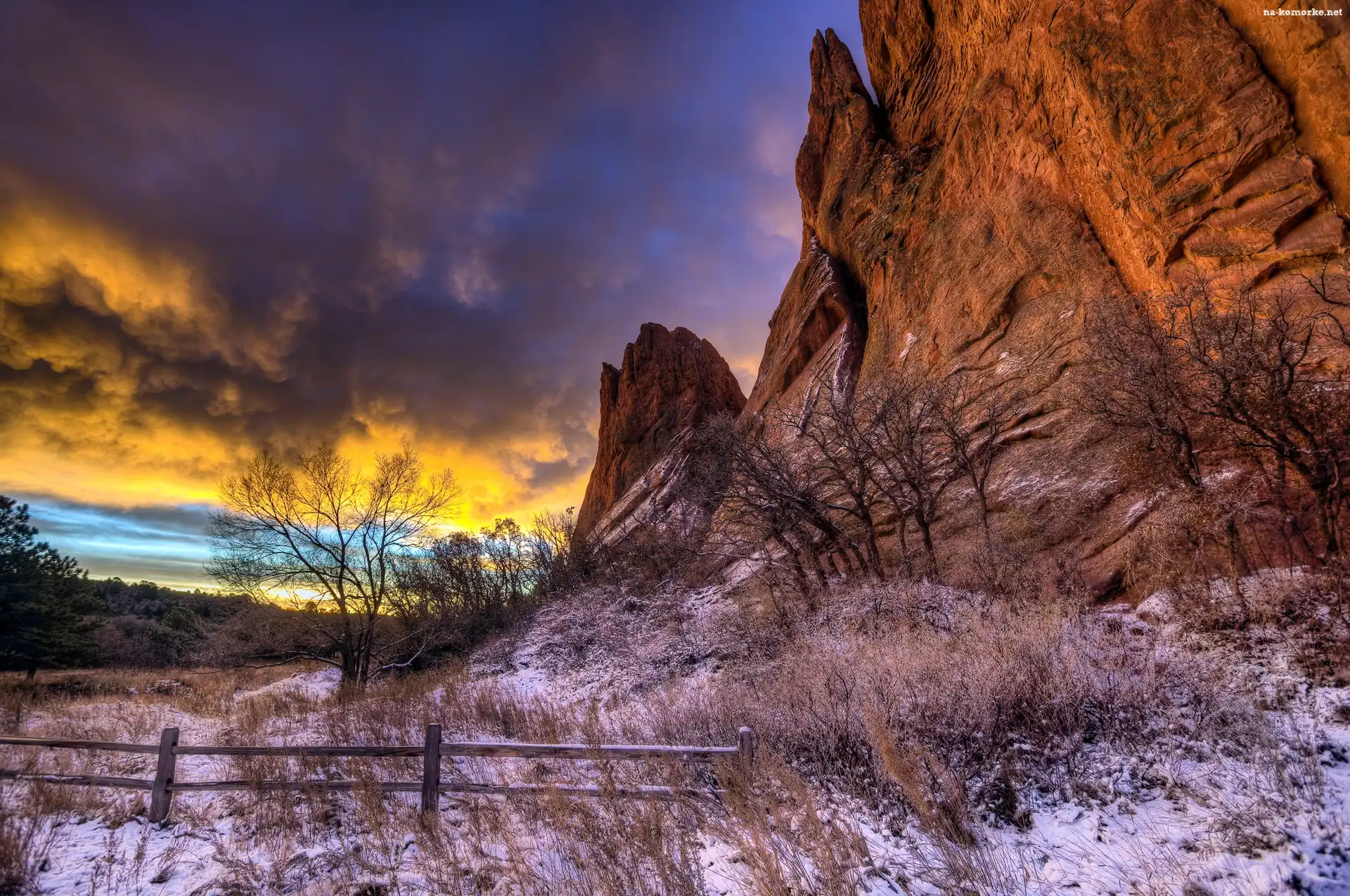 Zachód, Drzewa, Słońca, Skały na Komórkę