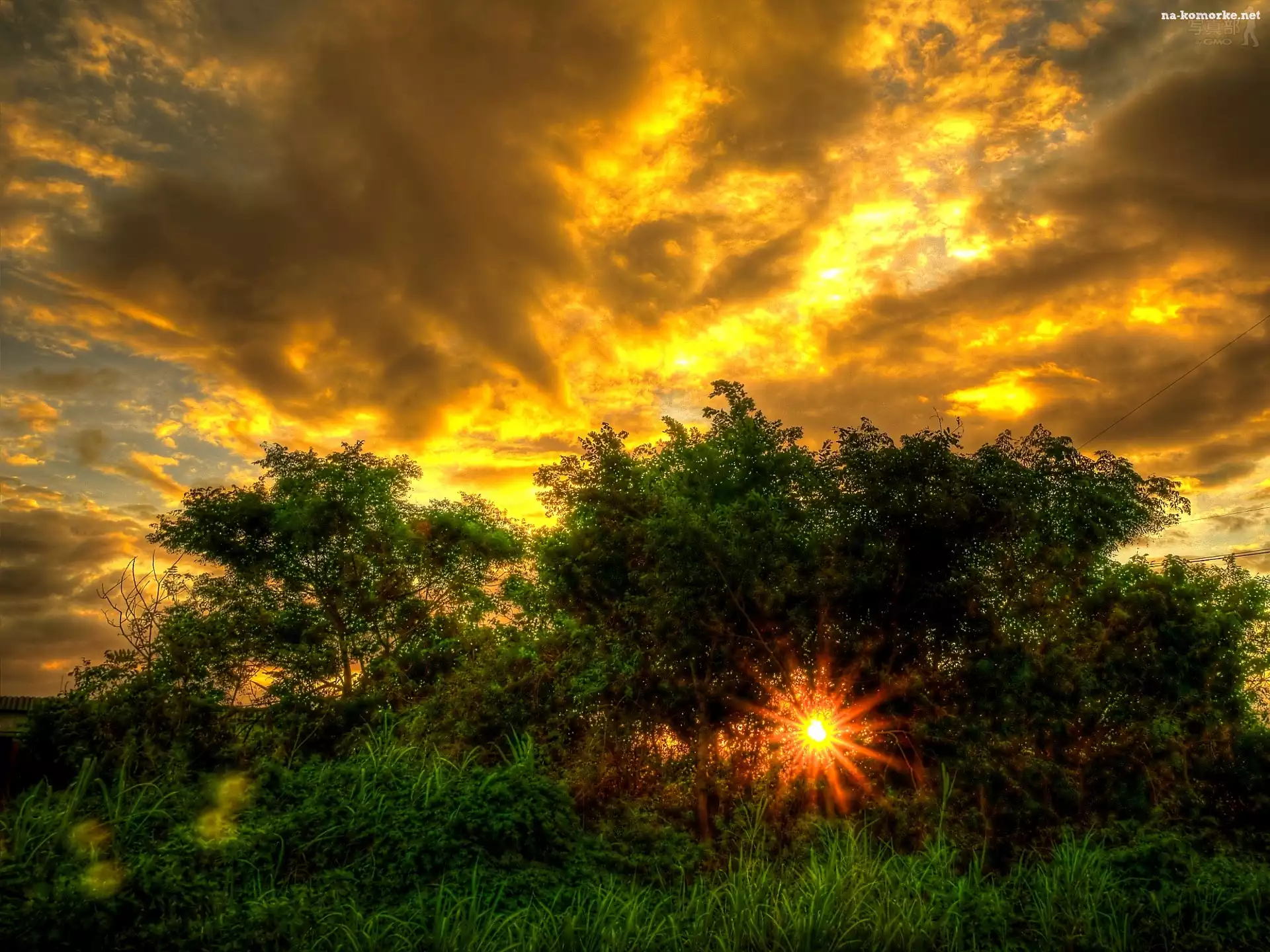Zachód, Drzewka, Słońca, Promienie na Komórkę