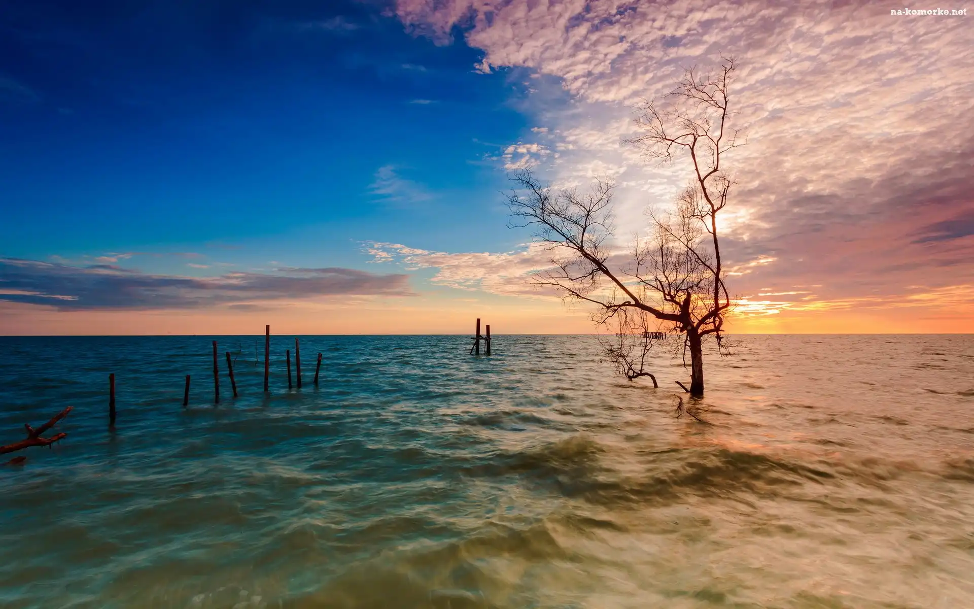 Zachód, Drzewo, Słońca, Morze na Komórkę