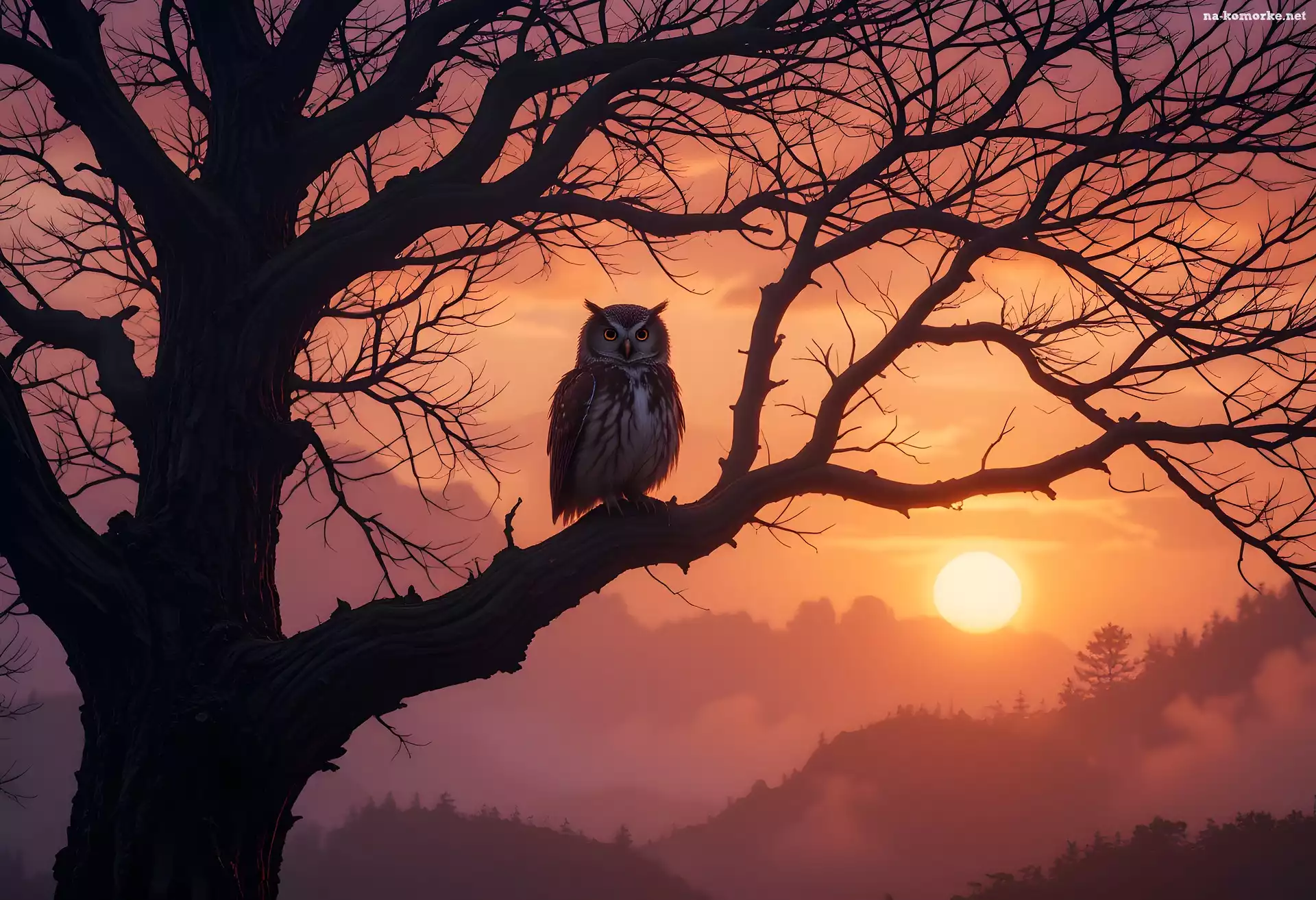 Konar, Zachód słońca, Sowa, Drzewo na Komórkę
