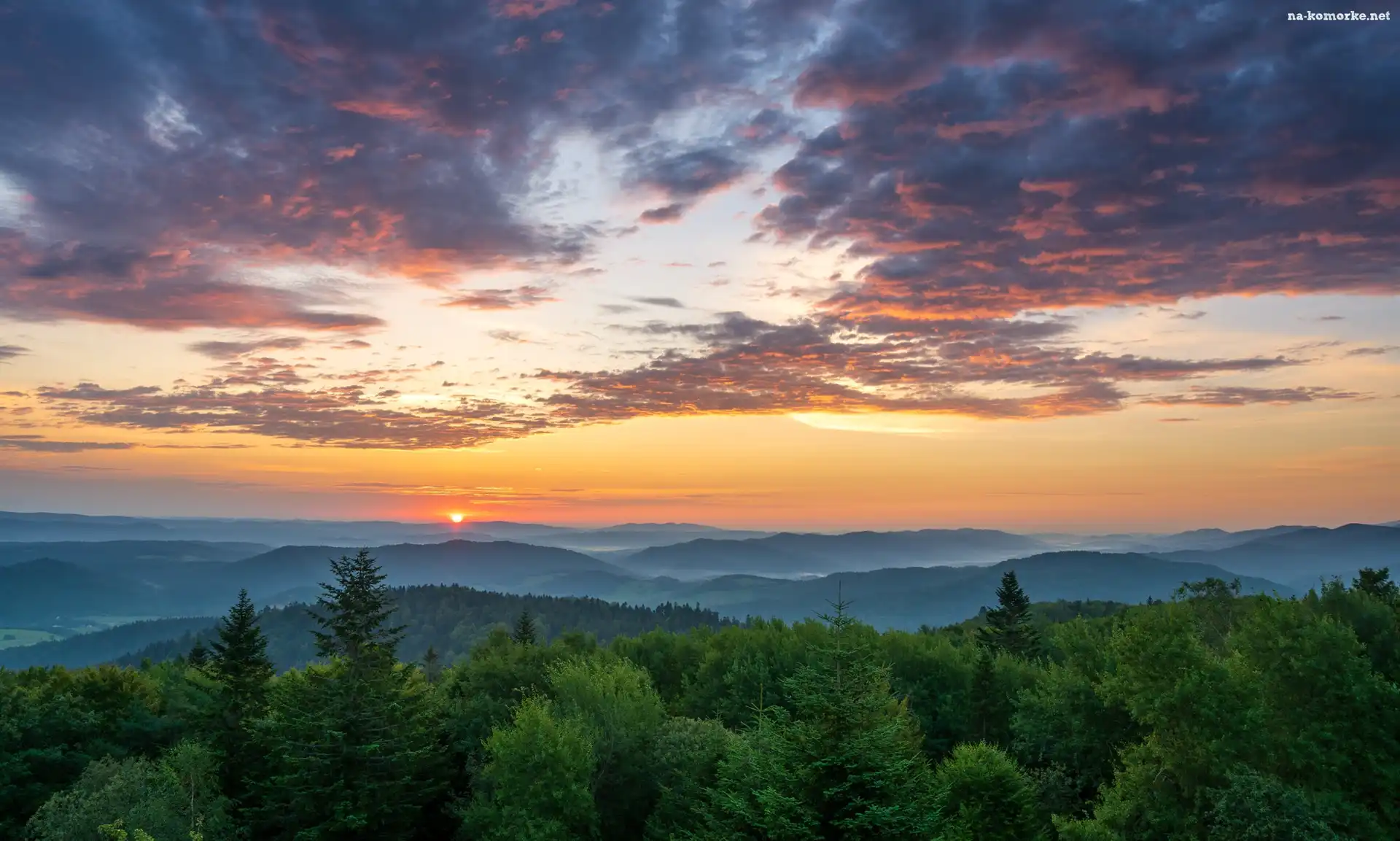 Niebo, Zachód słońca, Drzewa, Góry na Komórkę