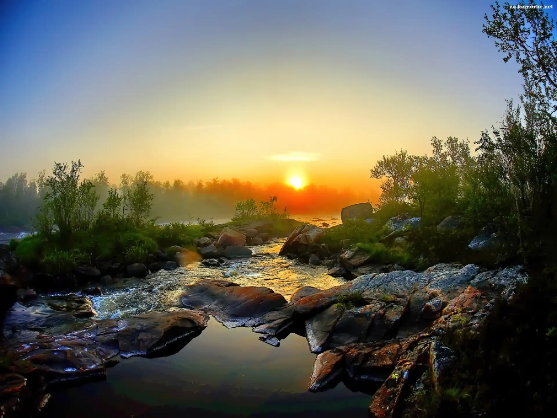 Zachód, Kamienie, Słońca, Rzeka na Komórkę