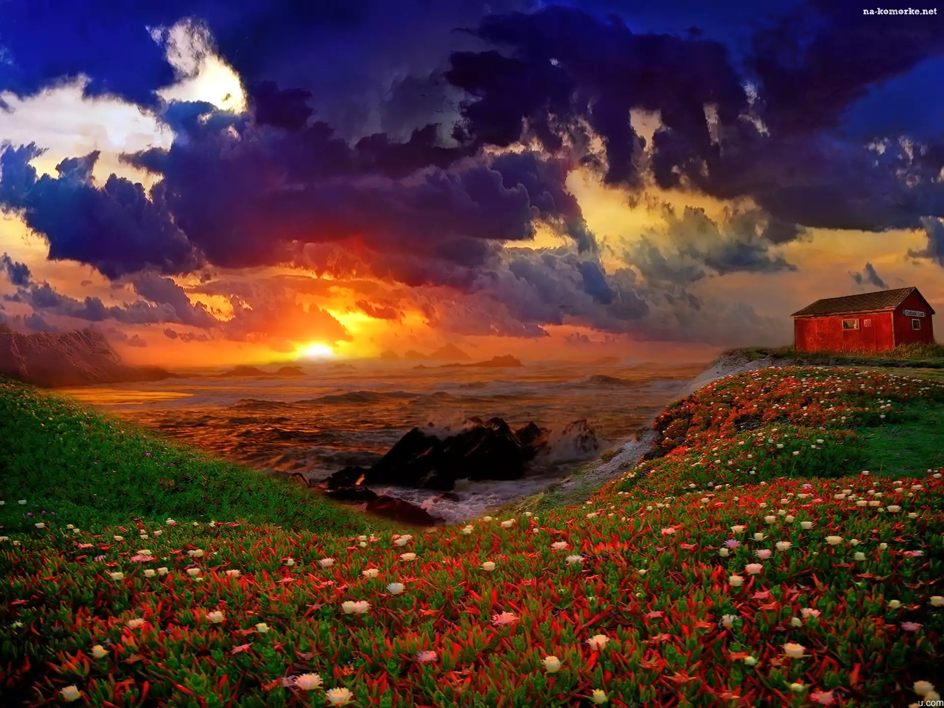 Zachód, Kwiatki, Słońca, Morze na Komórkę