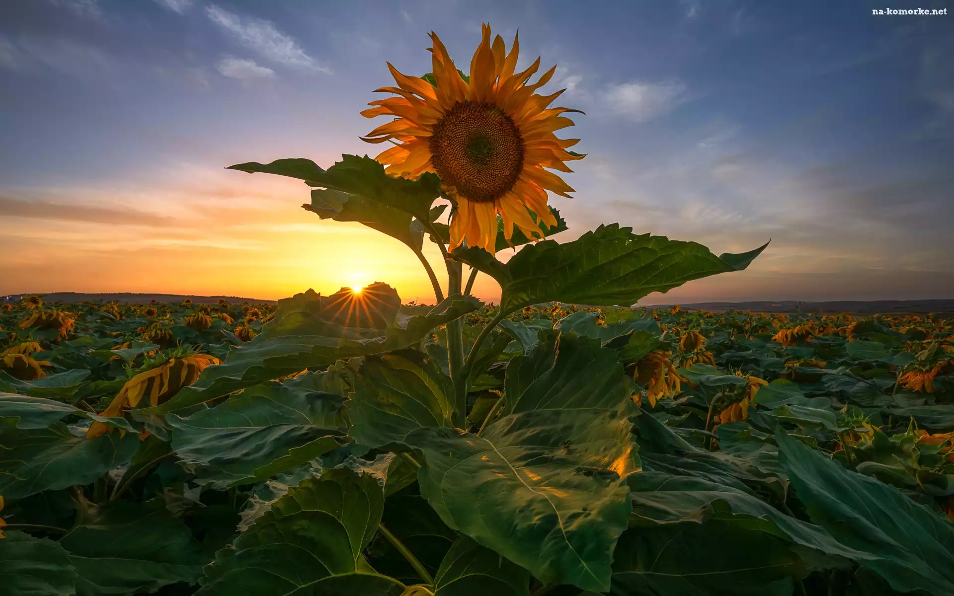 Liście, Zachód słońca, Słoneczniki, Kwiaty na Komórkę
