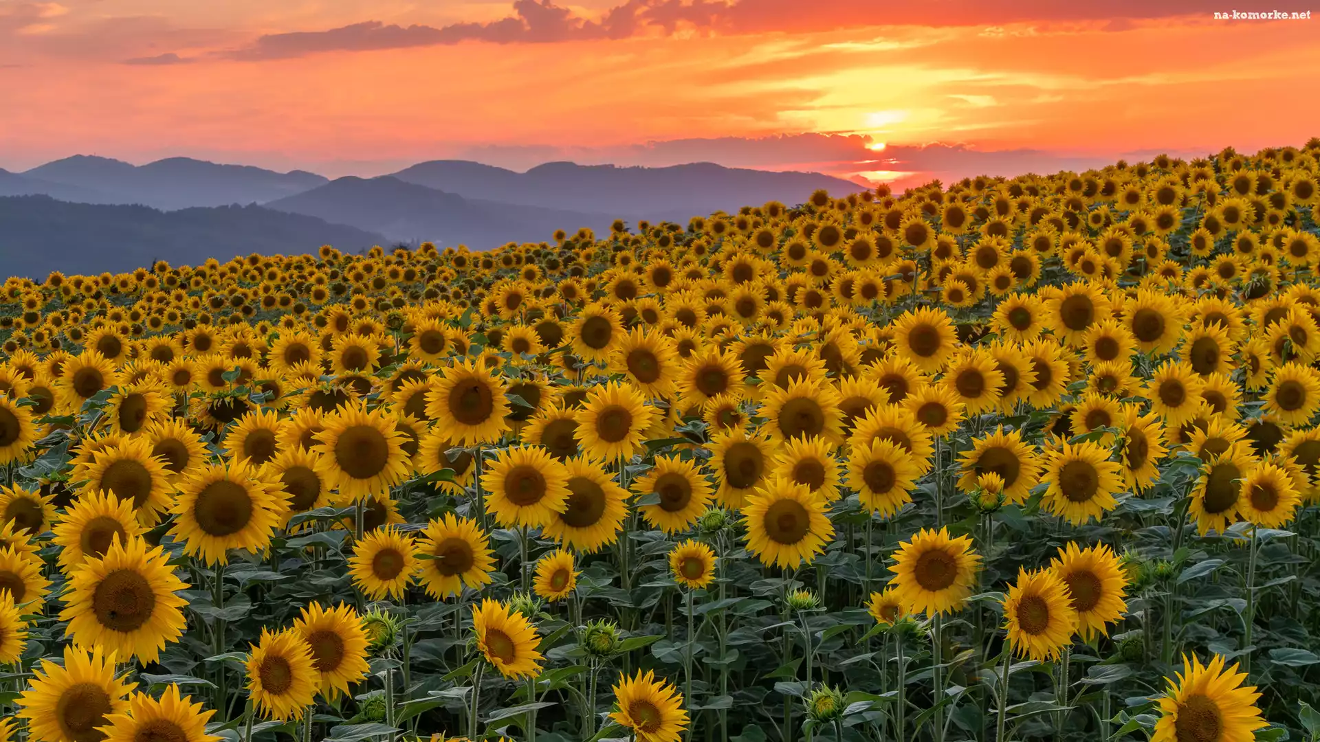 Słoneczniki, Zachód słońca, Pole, Kwitnące na Komórkę