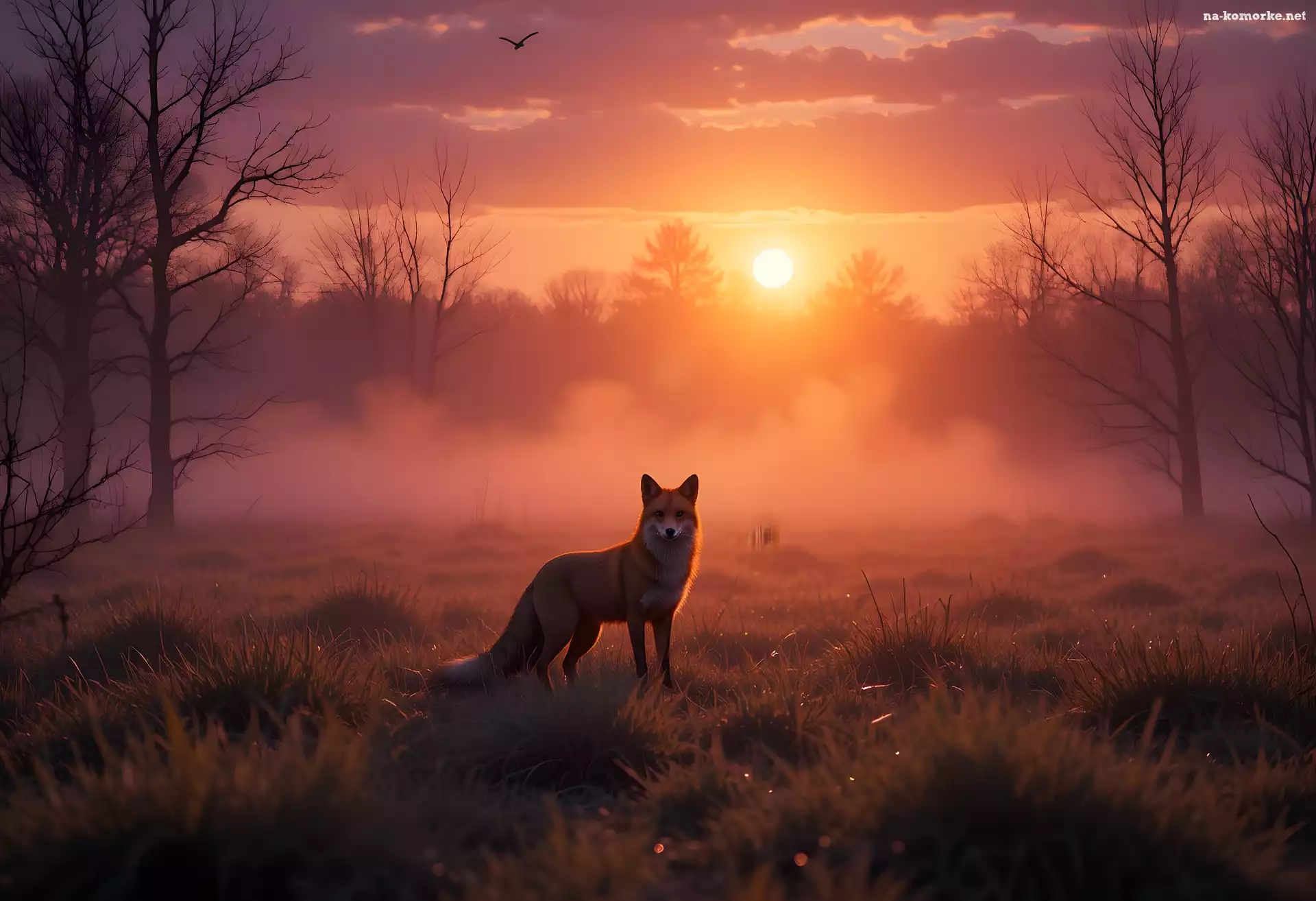 Mgła, Zachód słońca, Lis, Łąka na Komórkę