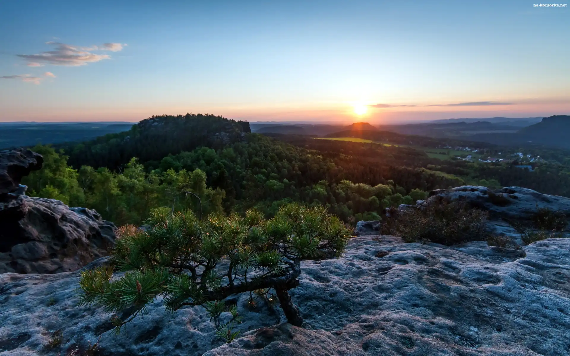 Zachód, Las, Słońca, Skały na Komórkę