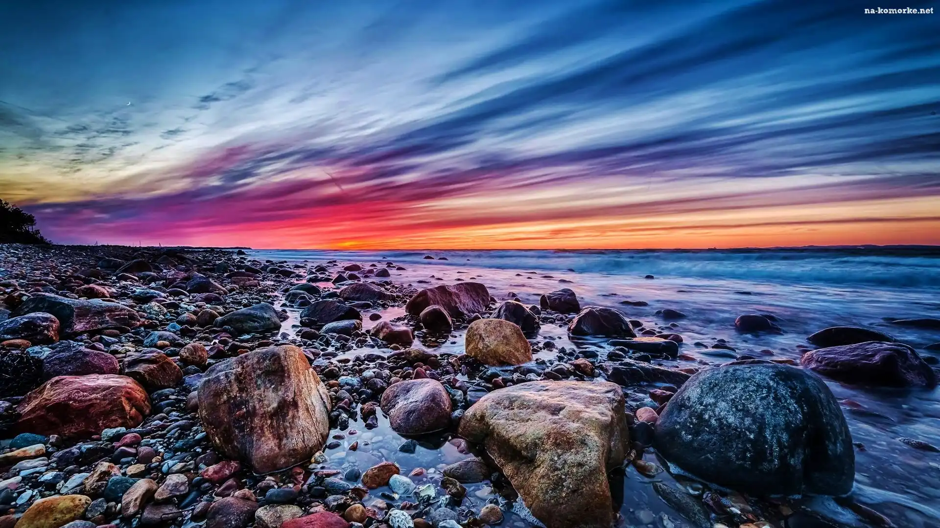 Zachód, Morze, Słońca, Kamienie na Komórkę