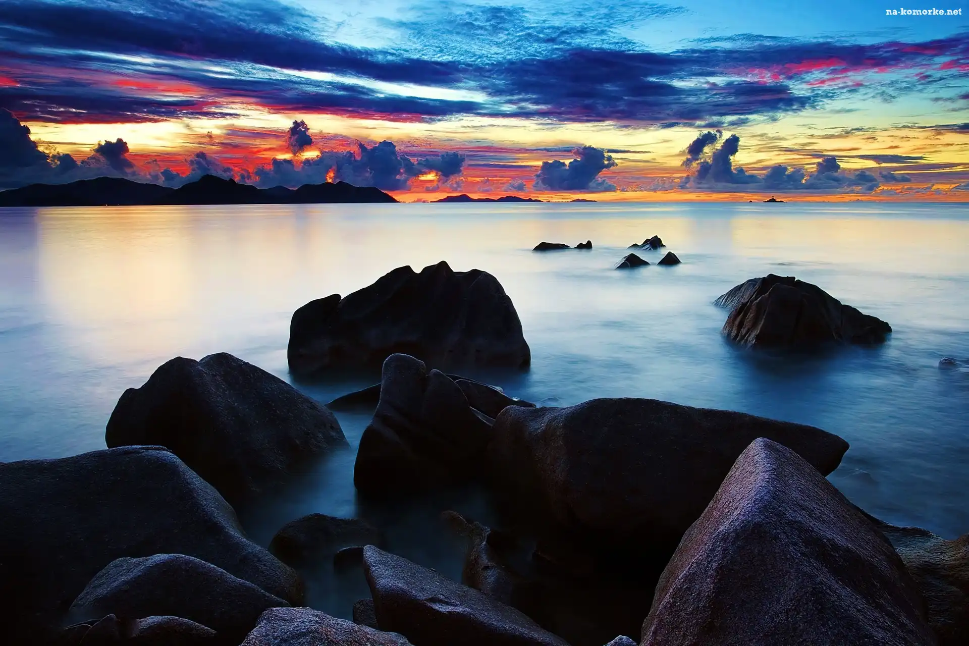 Zachód, Morze, Słońca, Kamienie na Komórkę