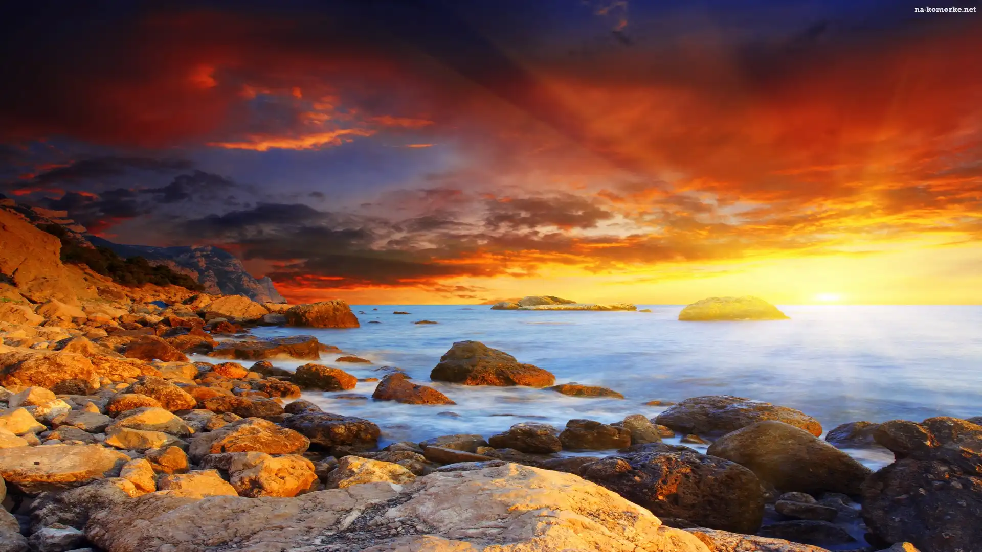 Zachód, Morze, Słońca, Kamienie na Komórkę