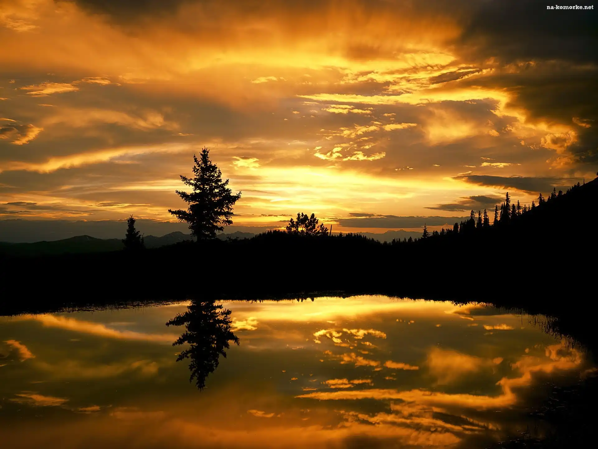 Zachód, Odbicie, Słońca, Jezioro na Komórkę