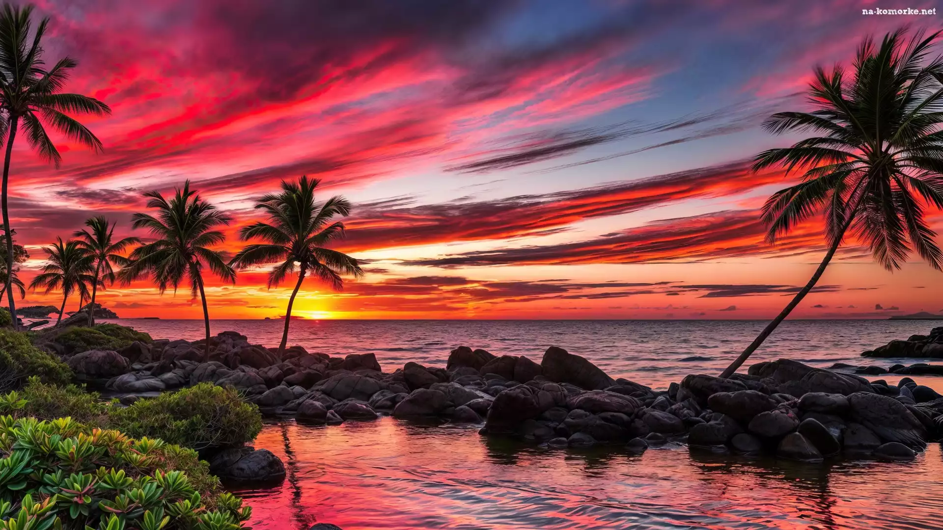 Roślinność, Zachód słońca, Morze, Palmy na Komórkę