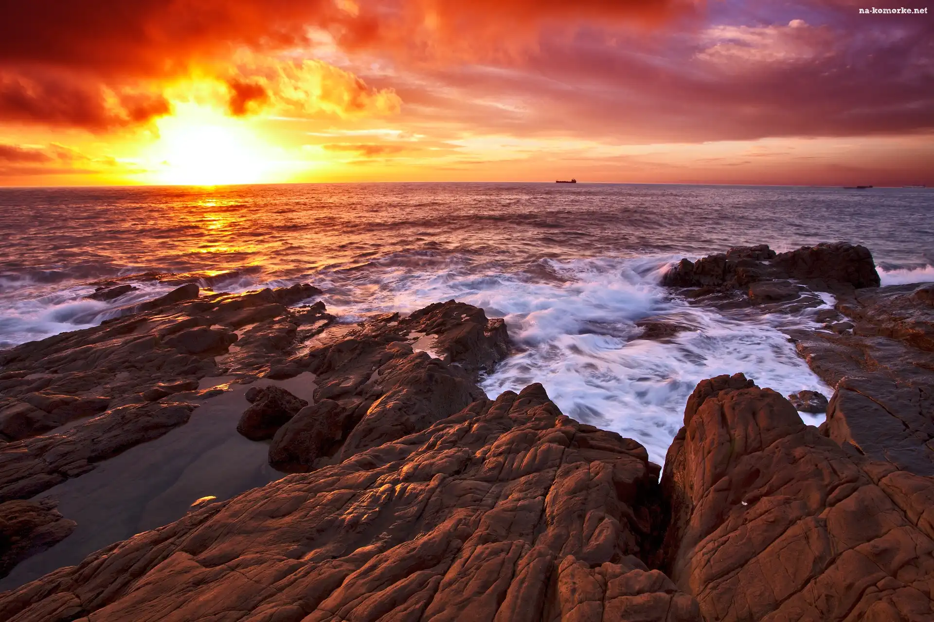 Zachód, Skałki, Słońca, Morze na Komórkę