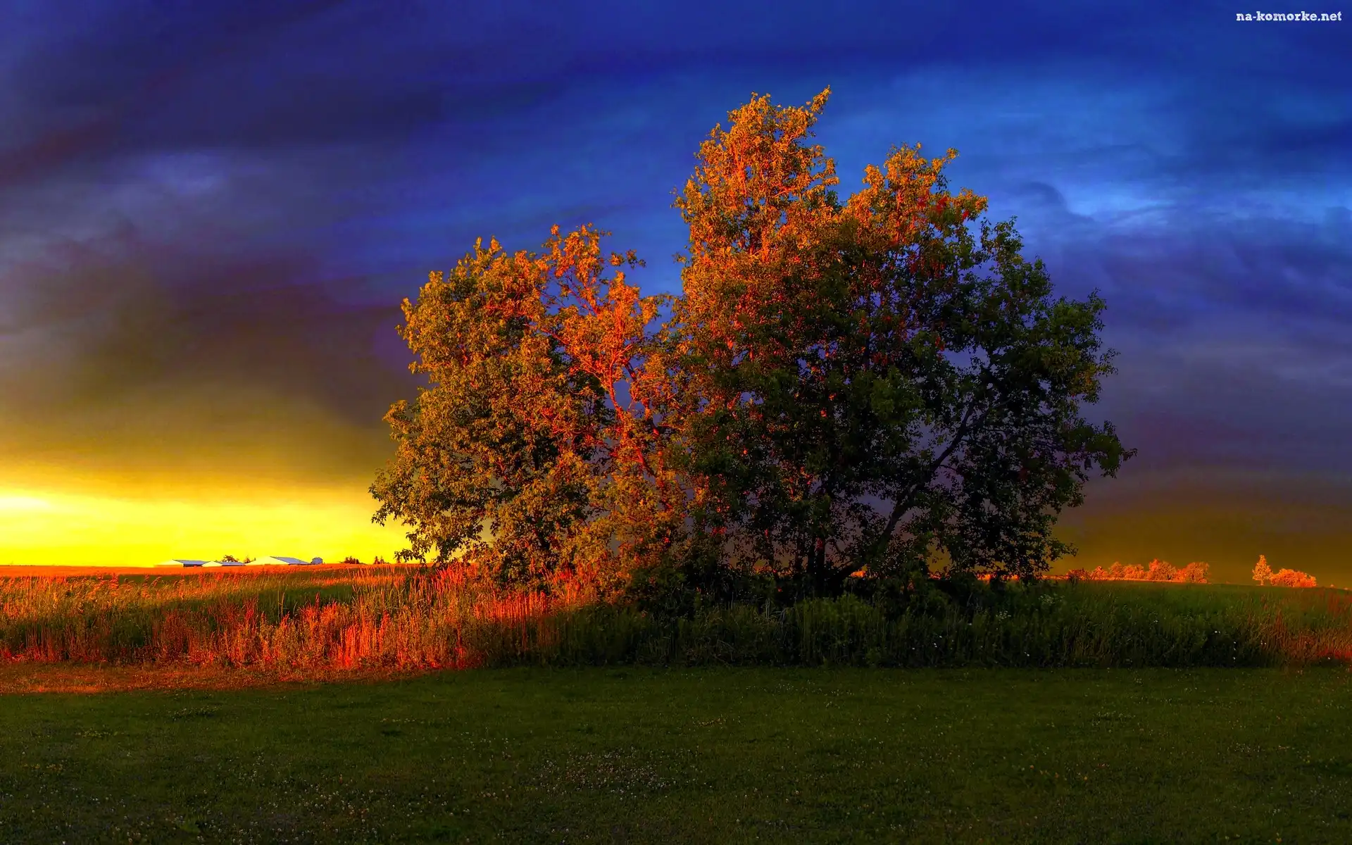 Zachód, Trawa, Słońca, Drzewo na Komórkę
