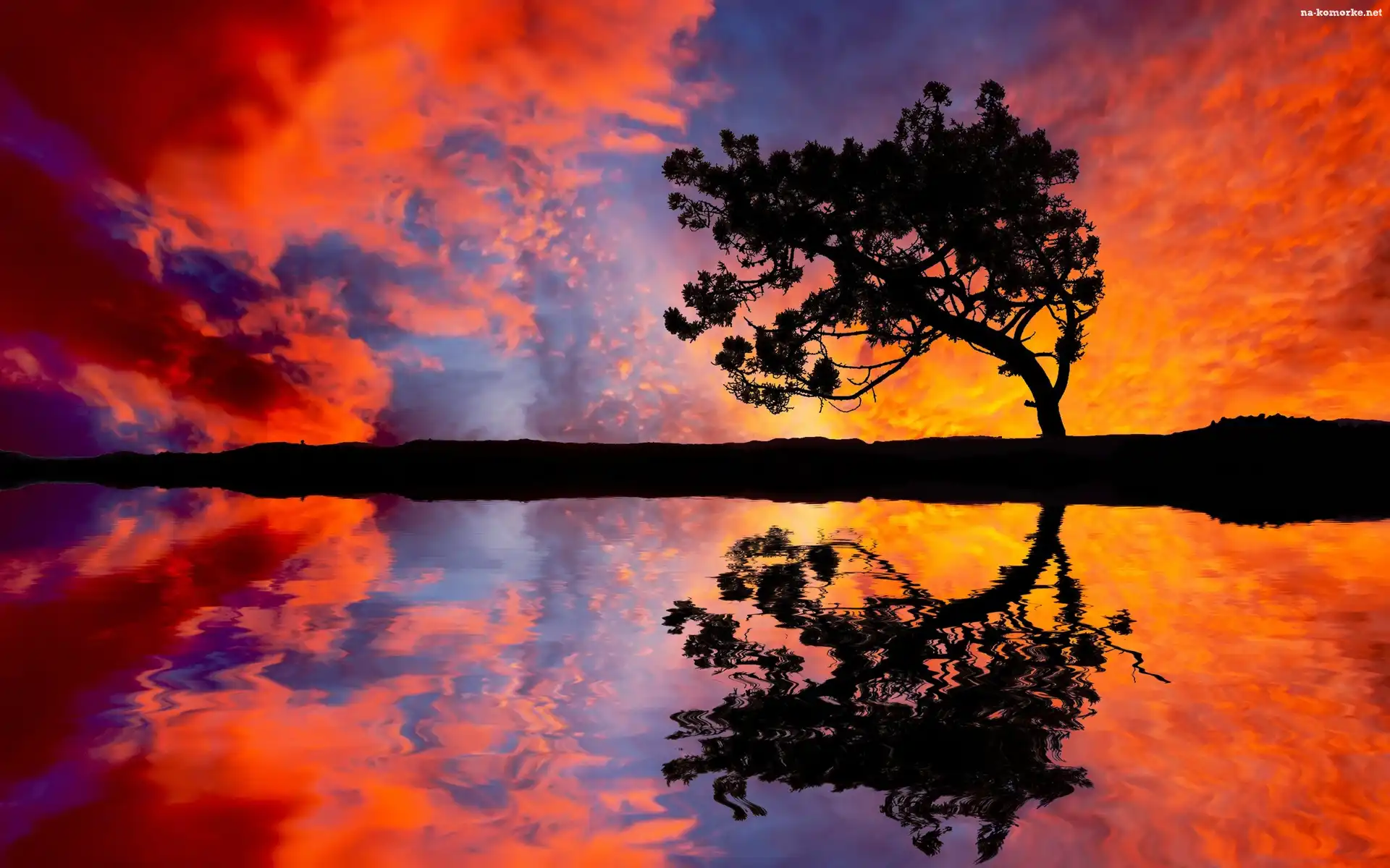Zachód, Woda, Słońca, Drzewo na Komórkę