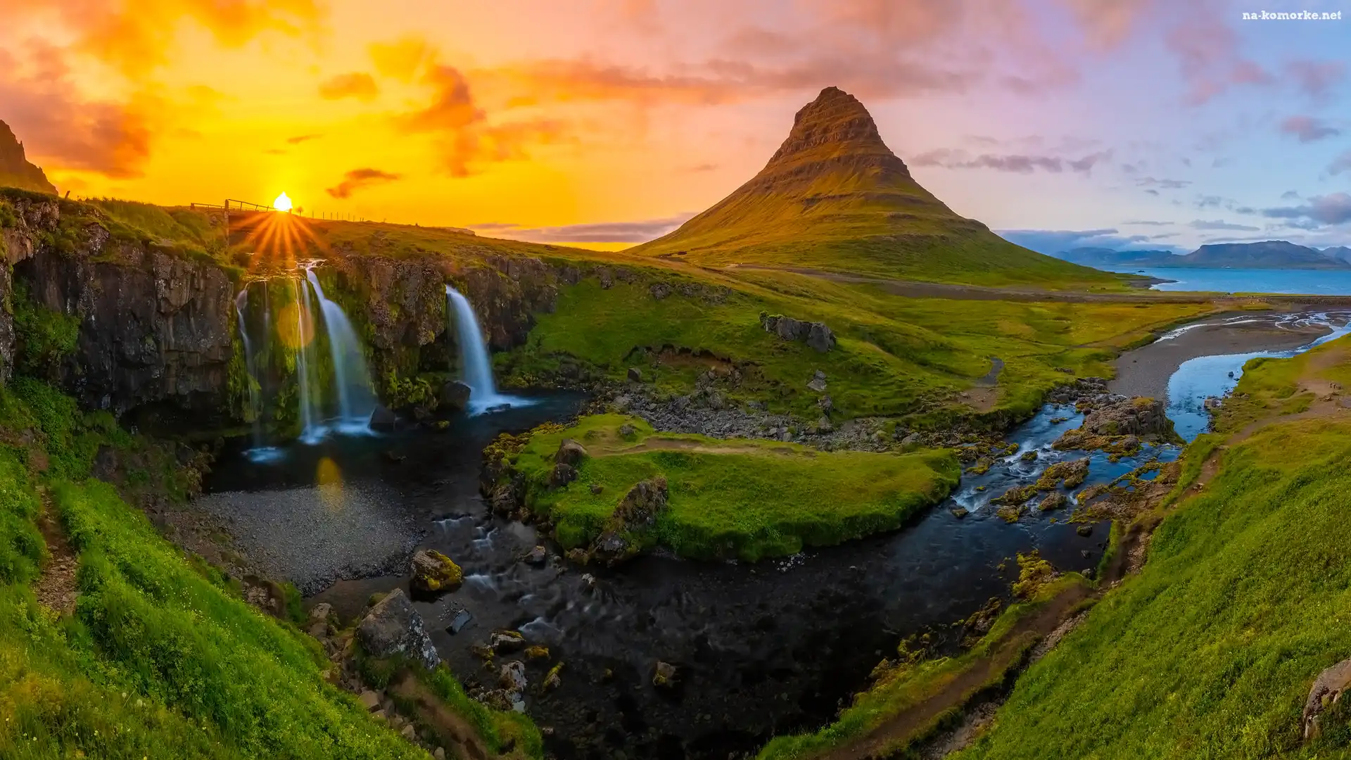 Zachód słońca, Promienie słońca, Półwysep Snaefellsnes, Islandia, Kirkjufell, Wodospady, Góra na Komórkę |