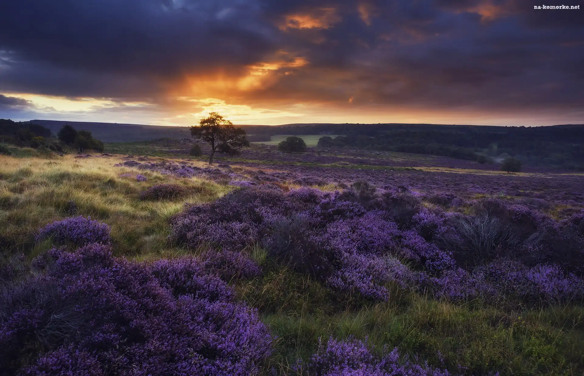 Zachód słońca, Wrzosy, Wrzosowisko, Drzewo na Komórkę