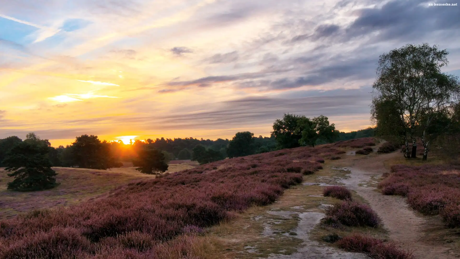 Zachód słońca, Wrzosowisko, Wrzosy, Drzewa na Komórkę