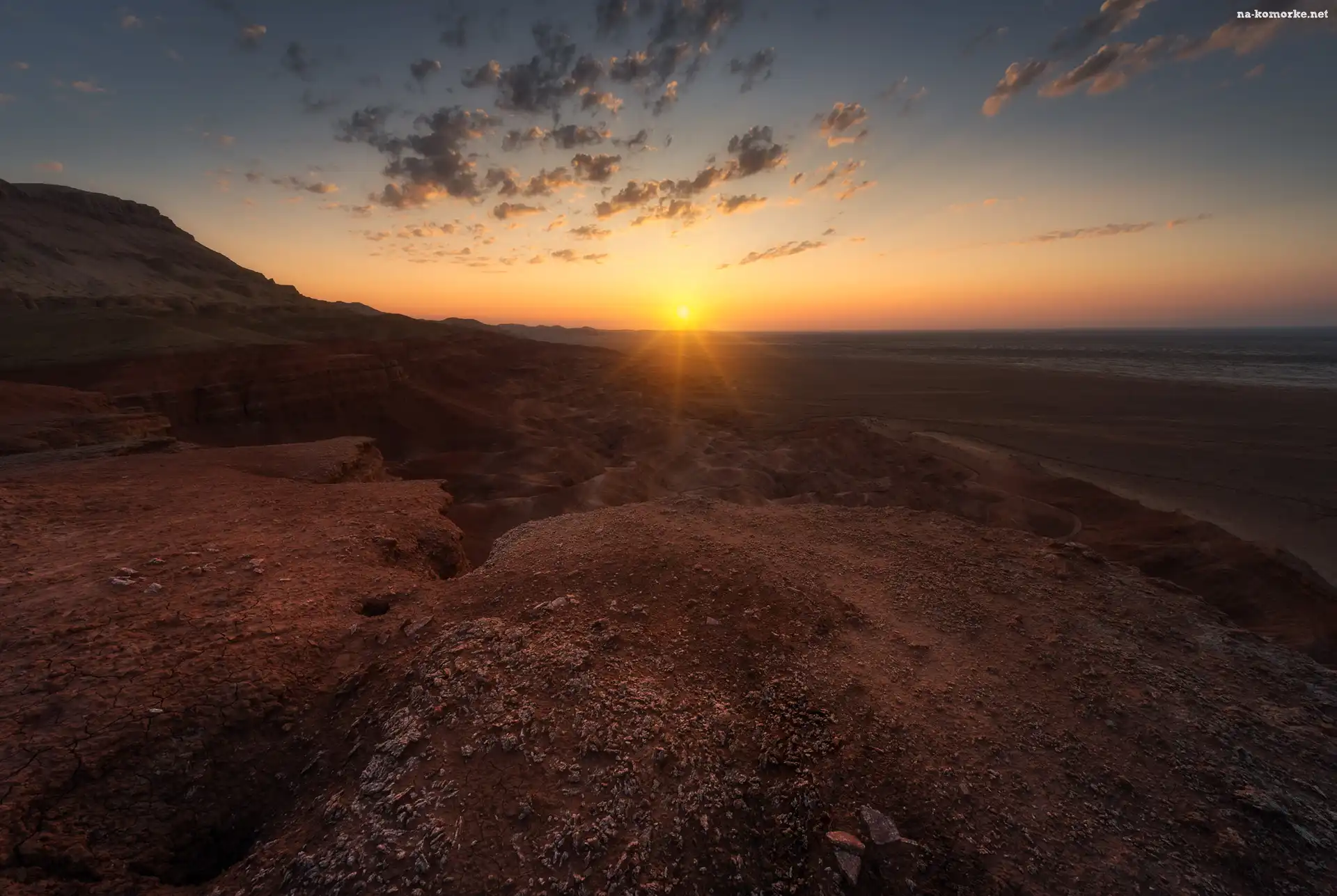 Zachód słońca, Chmury, Wzgórza, Kamienie na Komórkę