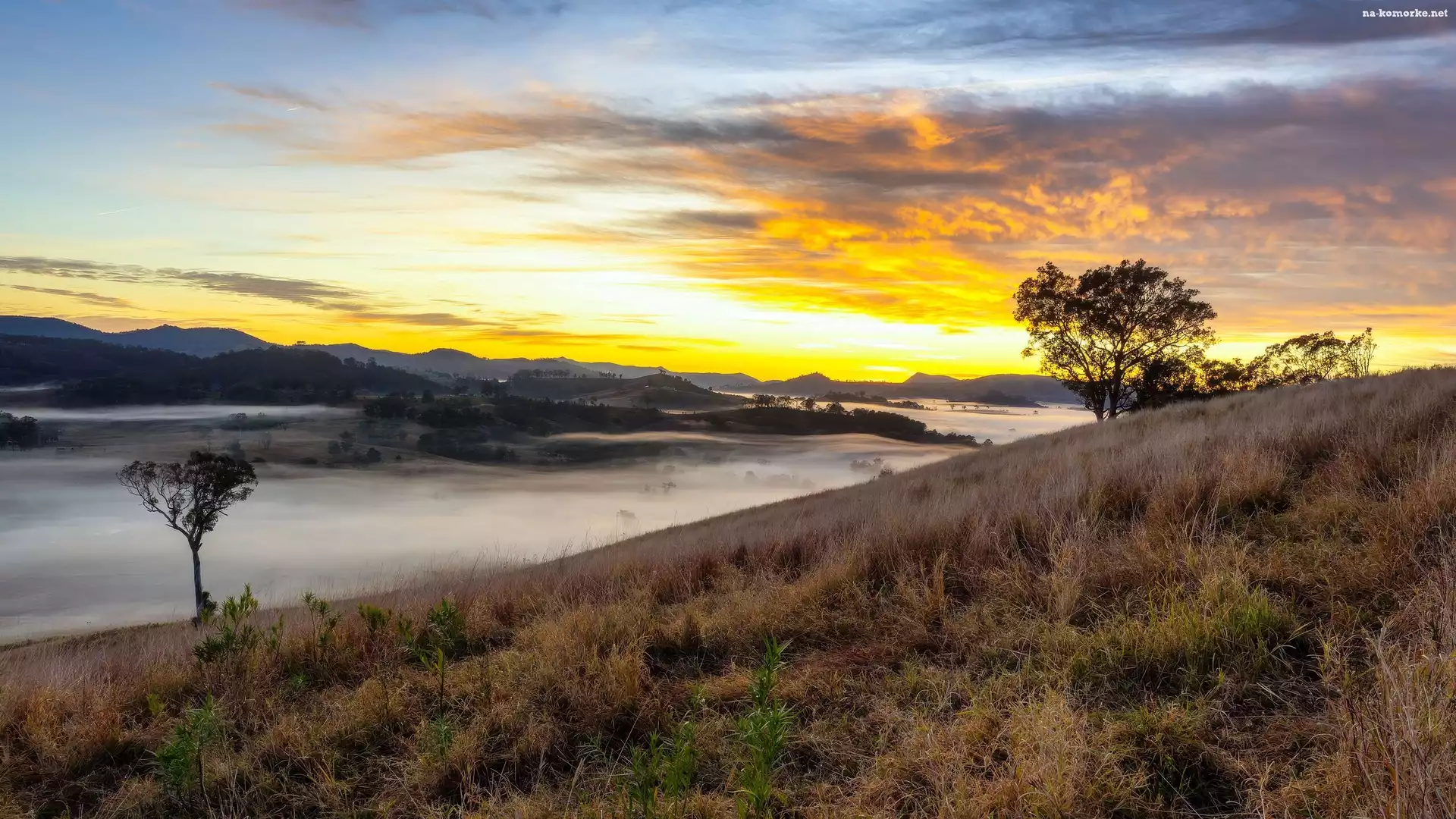 Mgła, Chmury, Drzewa, Zachód słońca, Wzgórze na Komórkę