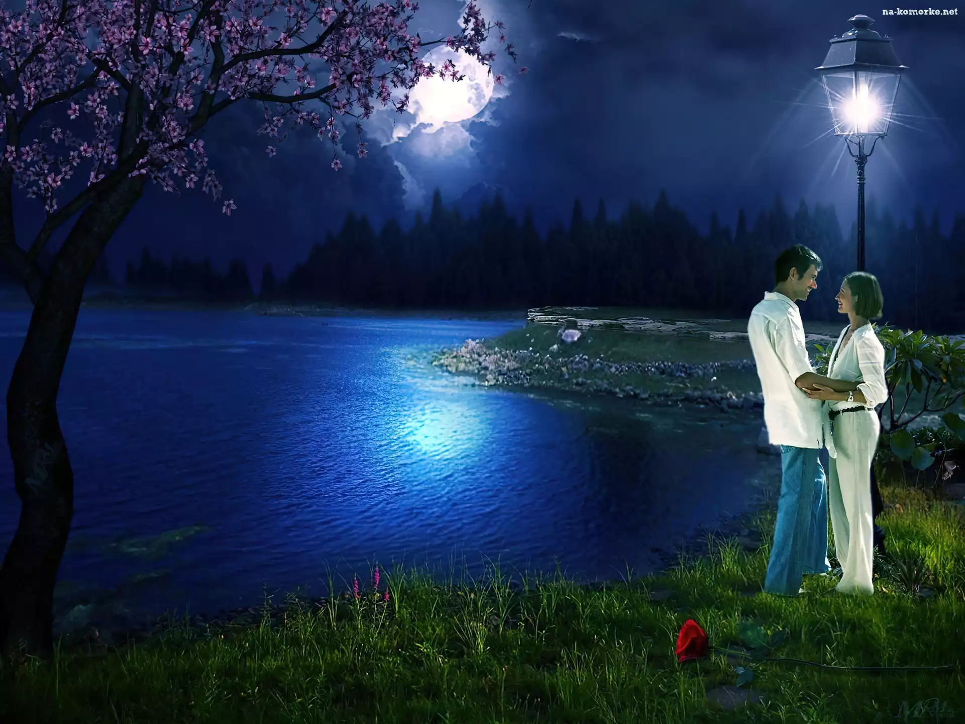 Zakochana, Jezioro, Para, Księżyc na Komórkę
