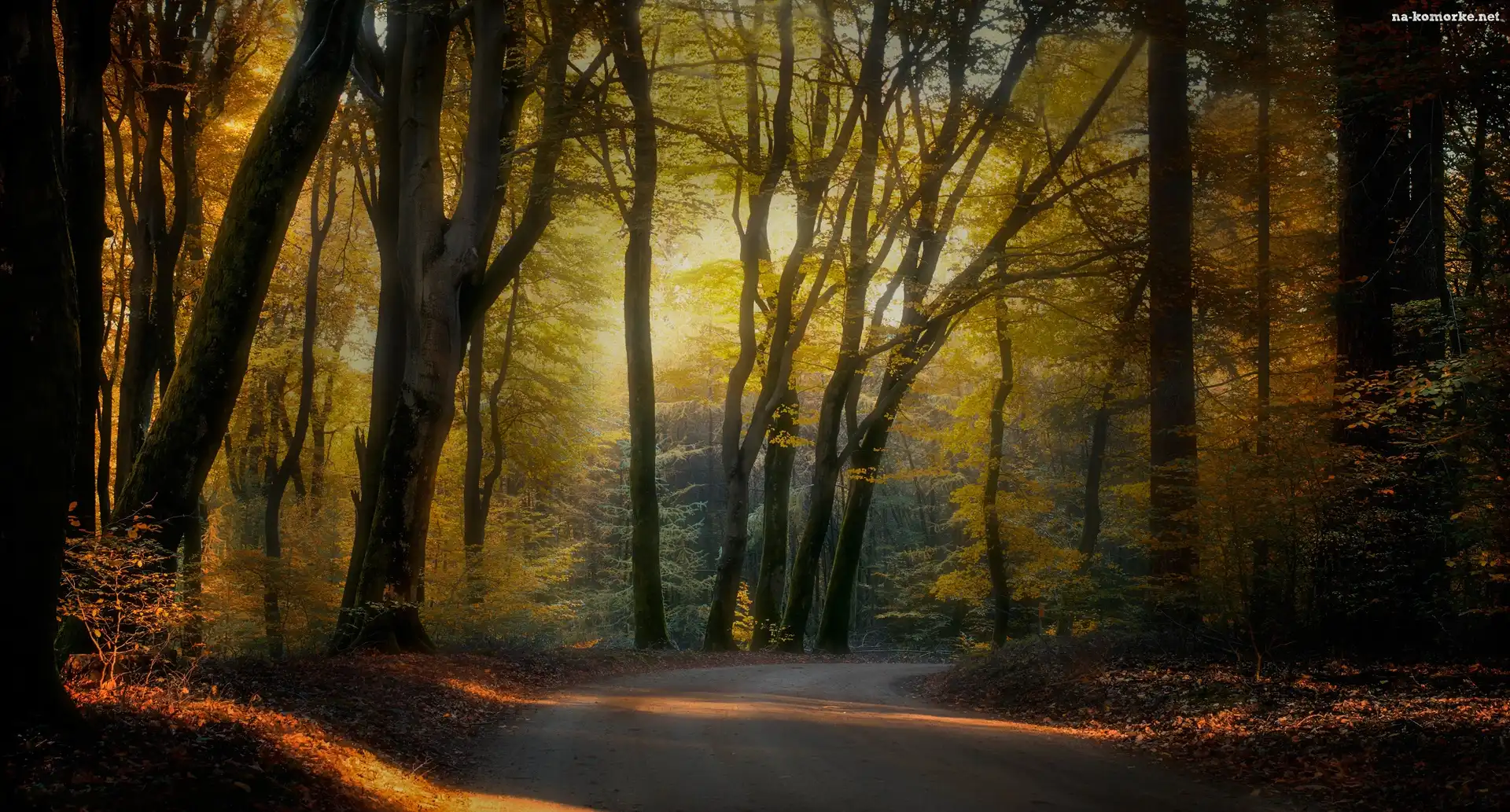 Zakręt, Jesień, Las, Drzewa, Droga na Komórkę