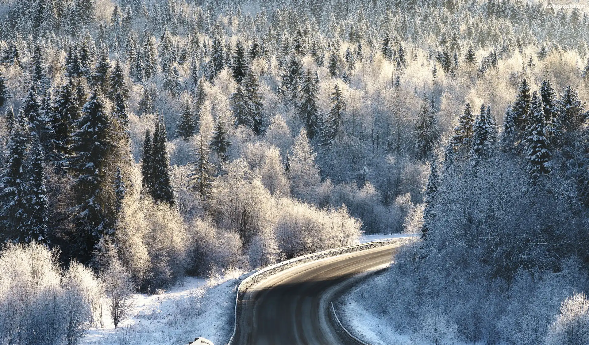 Zakręt, Zima, Las, Drzewa, Droga na Komórkę