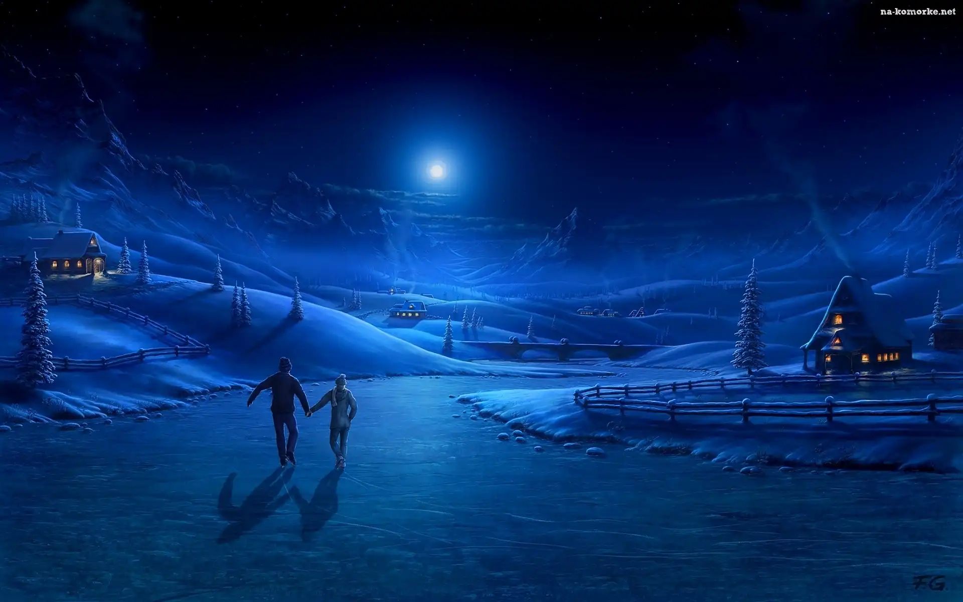 Rzeka, Noc, Zima, Góry, Zamarznięta, Łyżwiarze na Komórkę