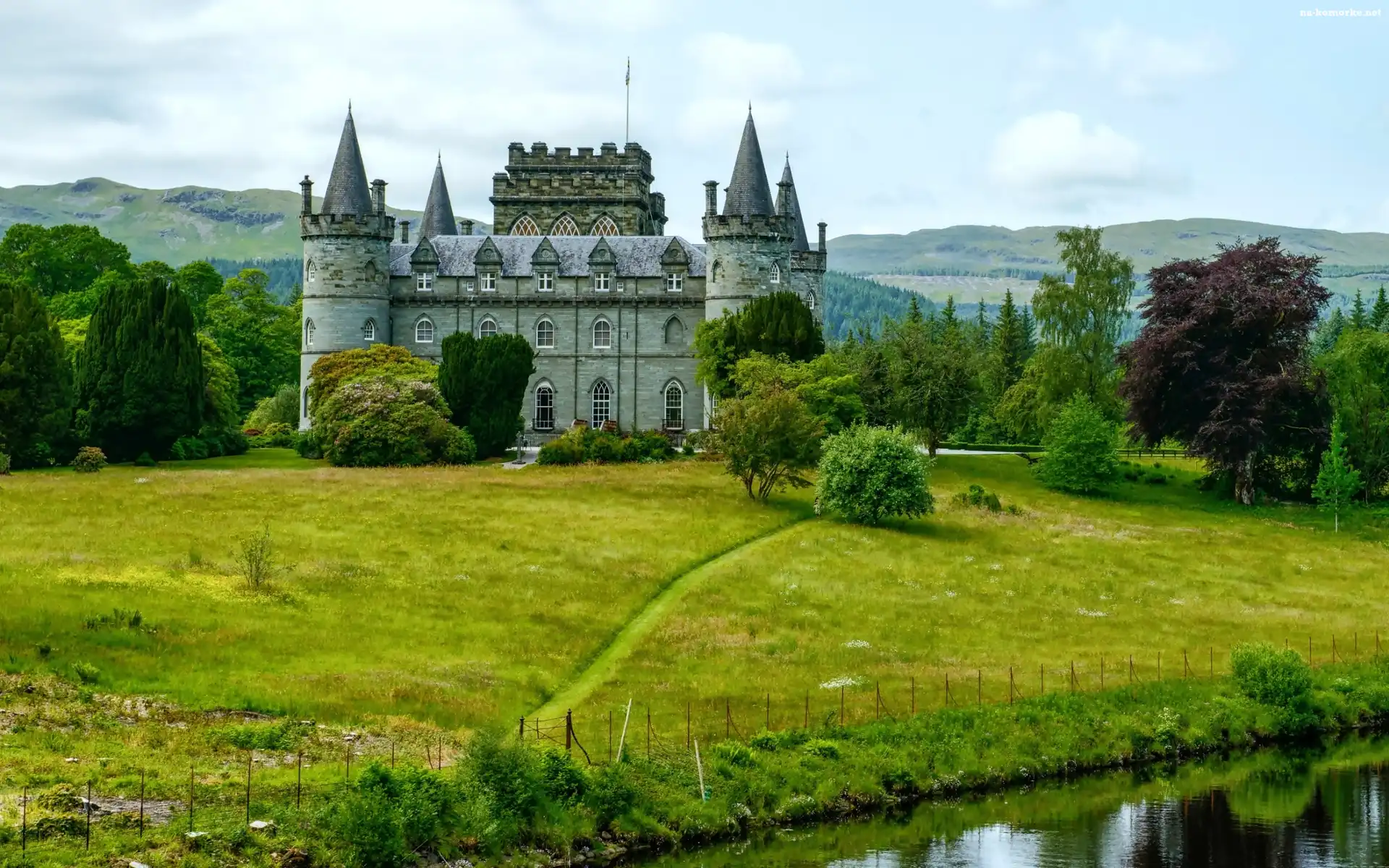 Zamek Inveraray, Szkocja, Drzewa, Wzgórza na Komórkę