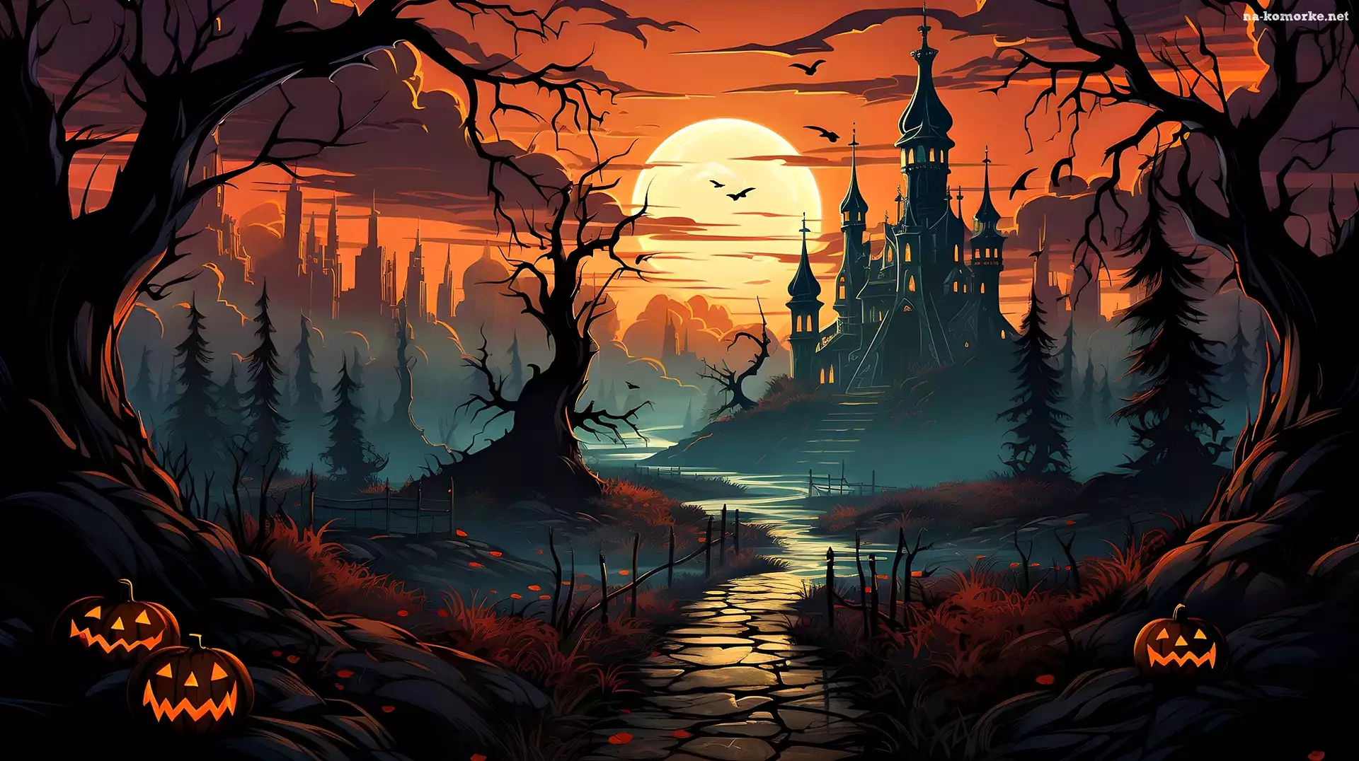 Zachód słońca, Dynie, Zamek, Grafika, Droga, Drzewa na Komórkę