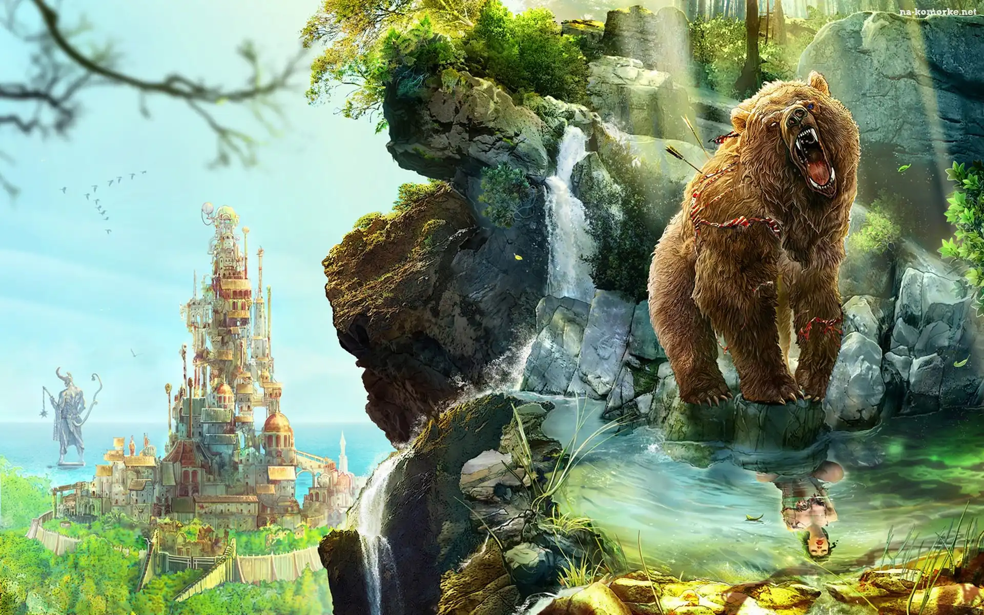 Ryczący, Zamek, Fantasy, Niedźwiedź, Odbicie, Kobieta, Skały na Komórkę