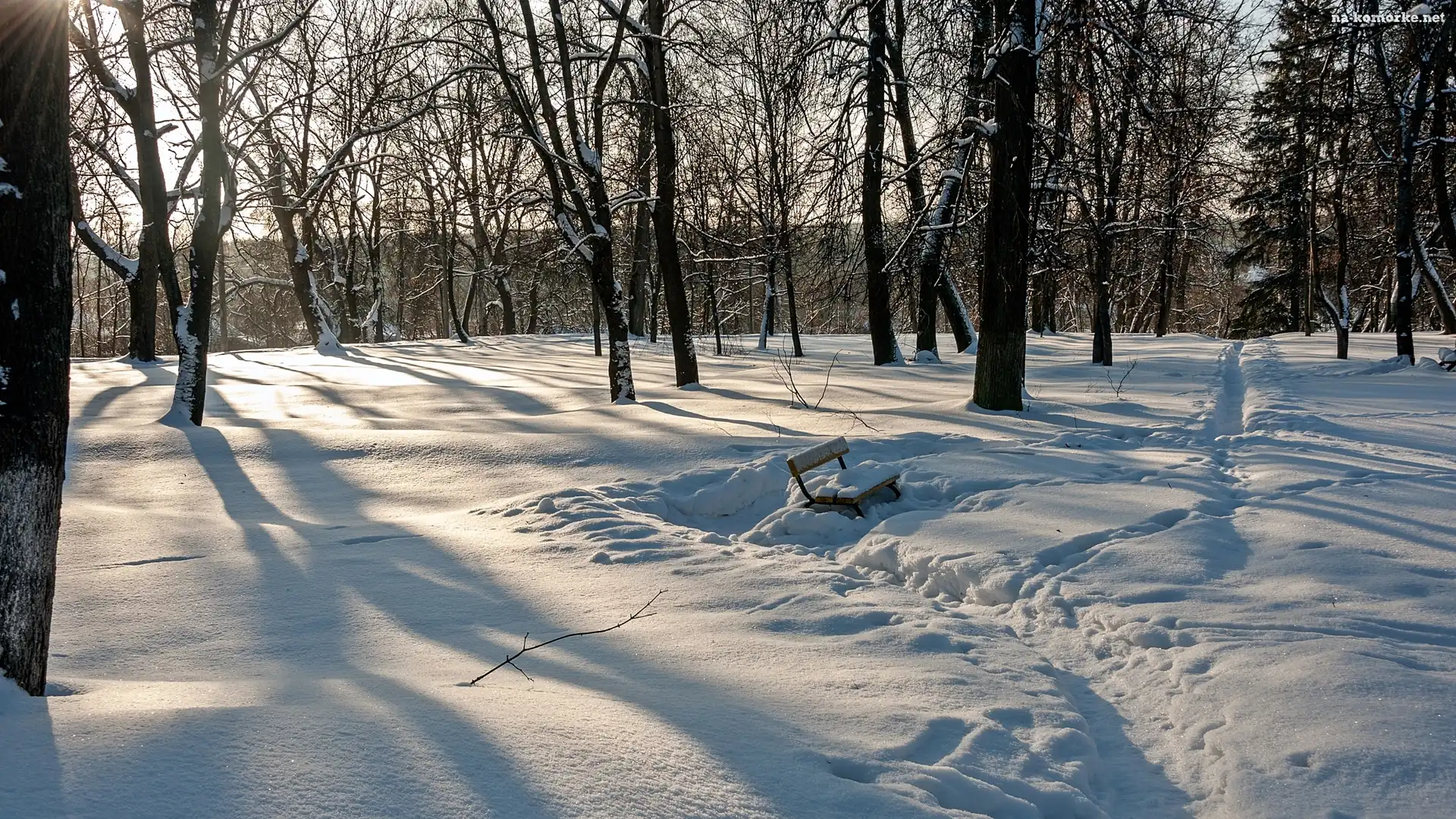 Zaśnieżona, Las, Zima, Ślady, Drzewa, Ławka na Komórkę