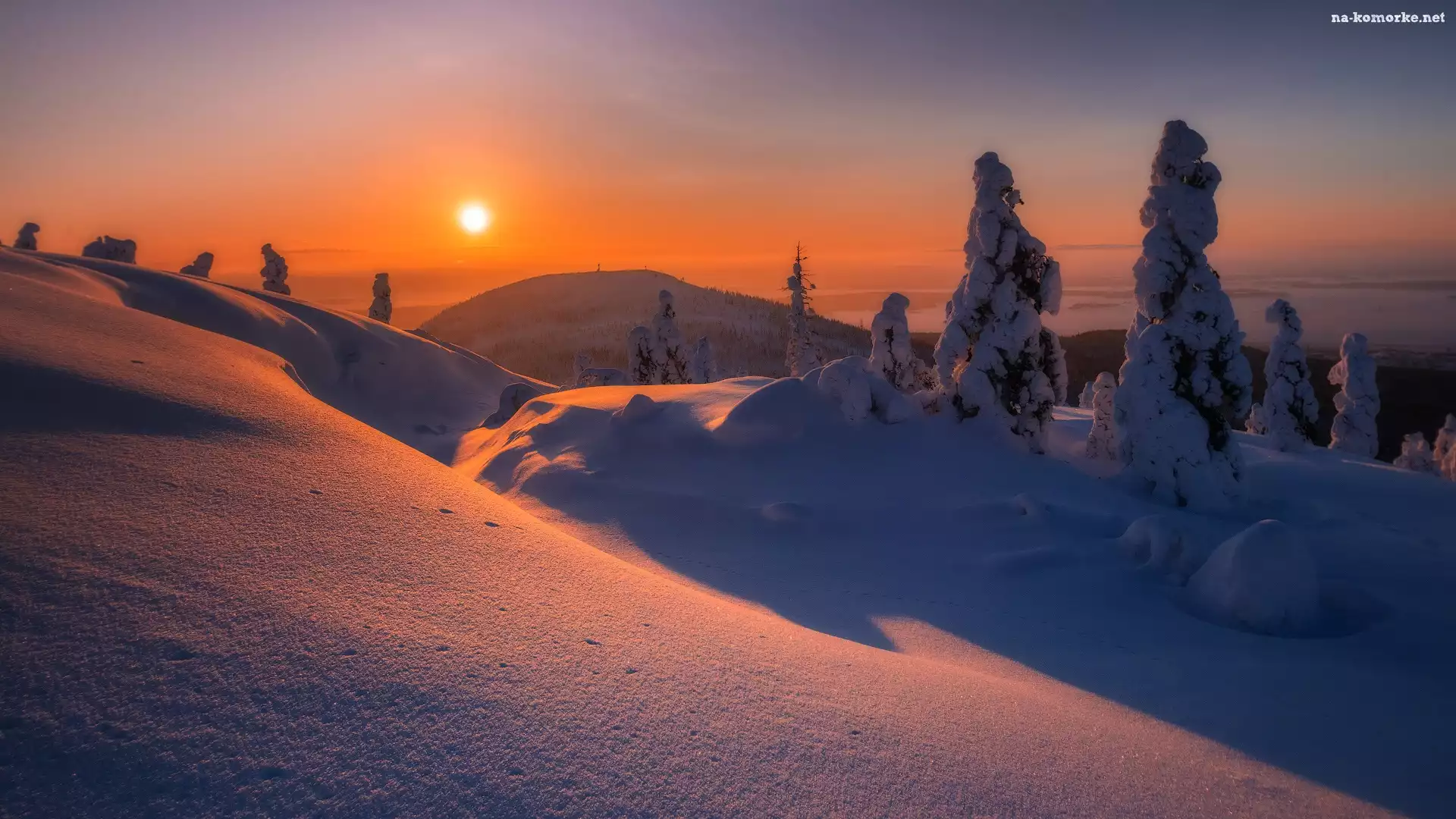 Zachód słońca, Zima, Zaspy, Góra, Drzewa, Śnieg na Komórkę
