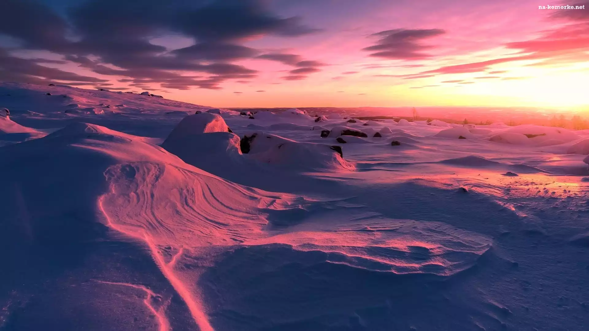 Śnieg, Zaspy, Zima, Wschód słońca na Komórkę