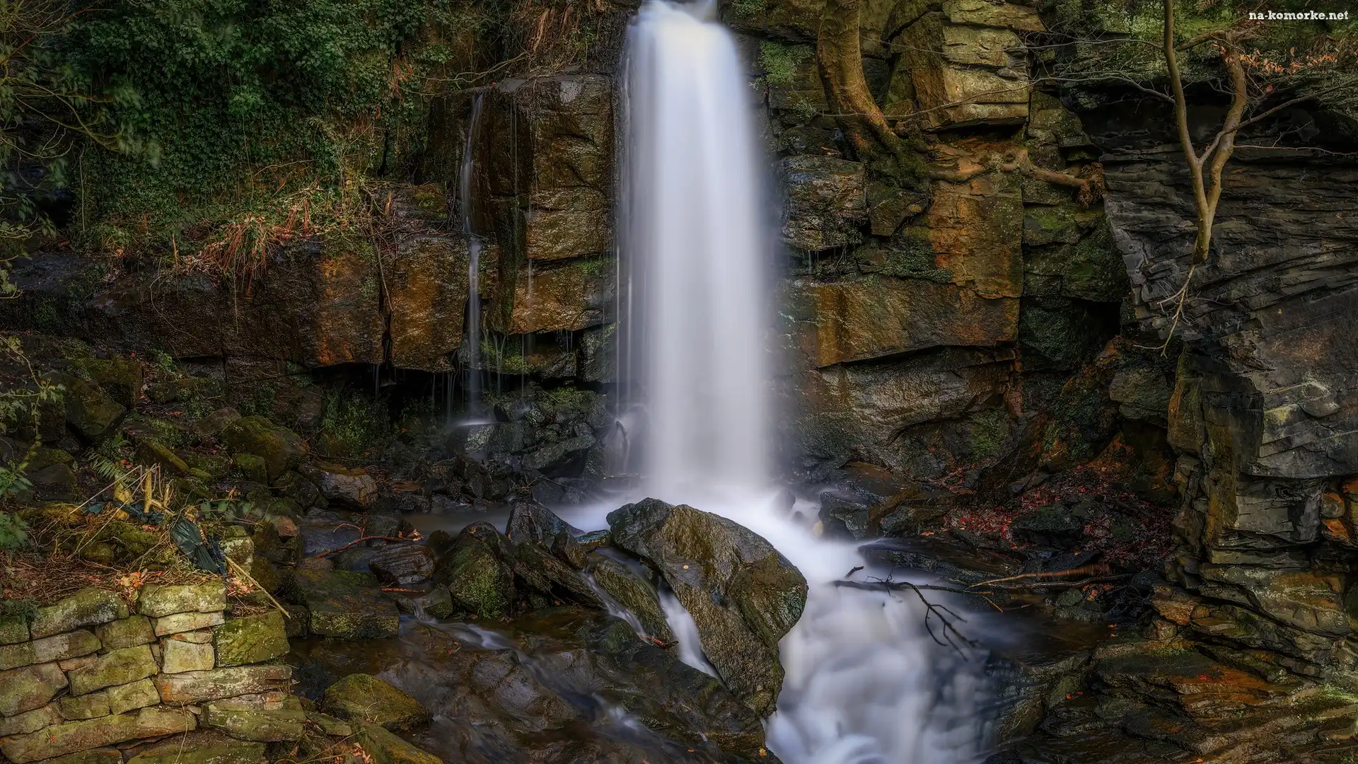 Skały, Rośliny, Wodospad, Zbliżenie na Komórkę