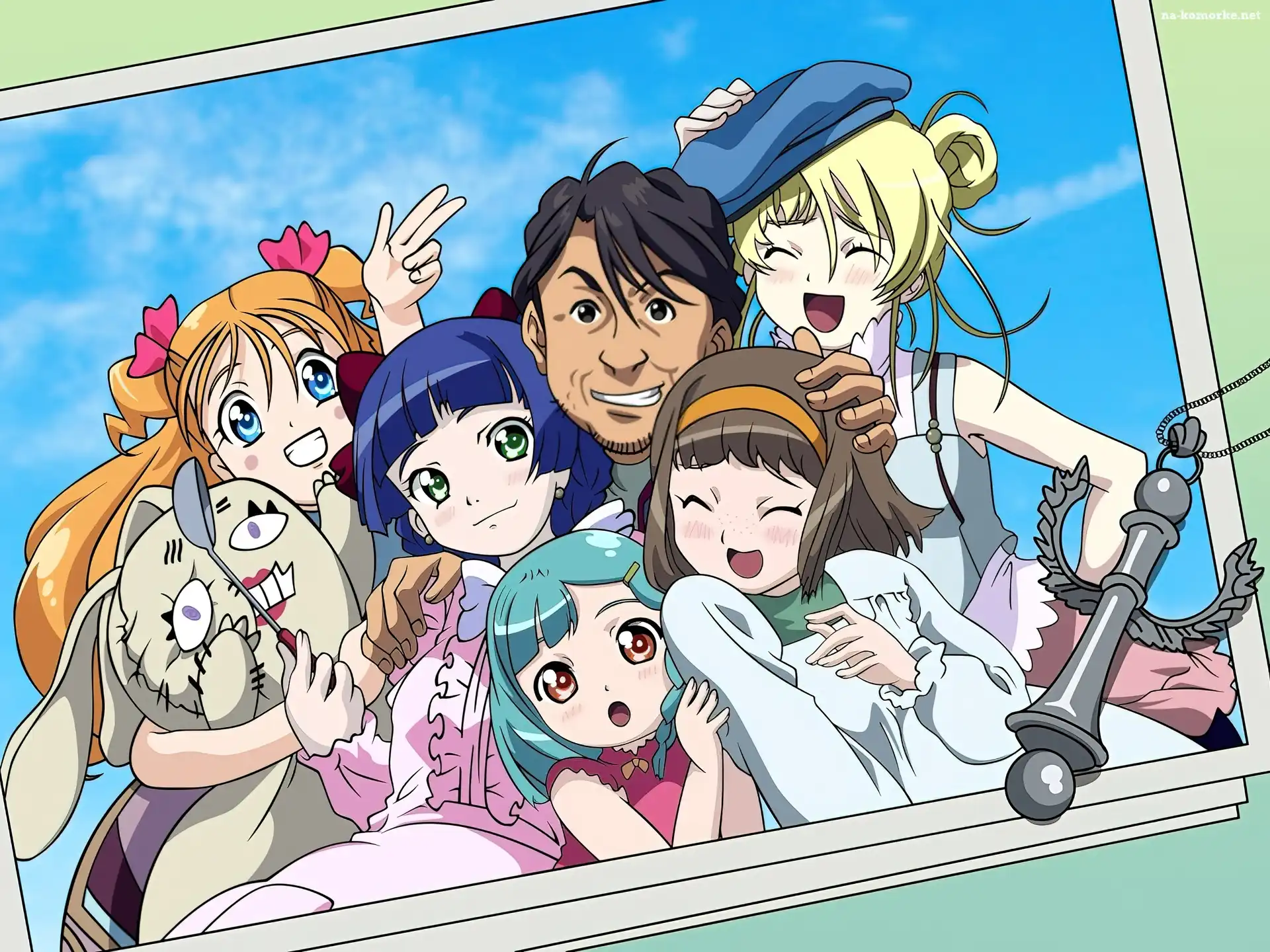 Simoun, dziewczynka, warkocze Simoun, szary strój Simoun, kobieta, fioletowy naszyjnik Simoun, przyjaciele Simoun, zdjęcie, kotwica Simoun, plecak, lizak Simoun, twarz, niebieskie oczy