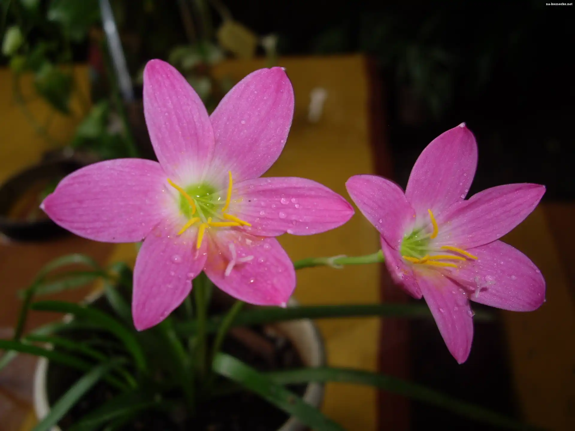Zephyranthes, Dwa, Różowe, Kwiaty, Zefiranty Fioletowy, Zefirant Żółty, Zefirant Kwiaty, Zefiranty, Różowe, Rozkwitnięte Dwa, Śliczne, Kwiatki Białe, Płatki, Krople Zielone, Suche, Łodygi Biały, Zefirant Żółty, Kwiatek Dwa, Zefiranty, Donica Białe, Płatki Śliczny, Kwiat Żółte, Zefiranty Fioletowy, Zefirant